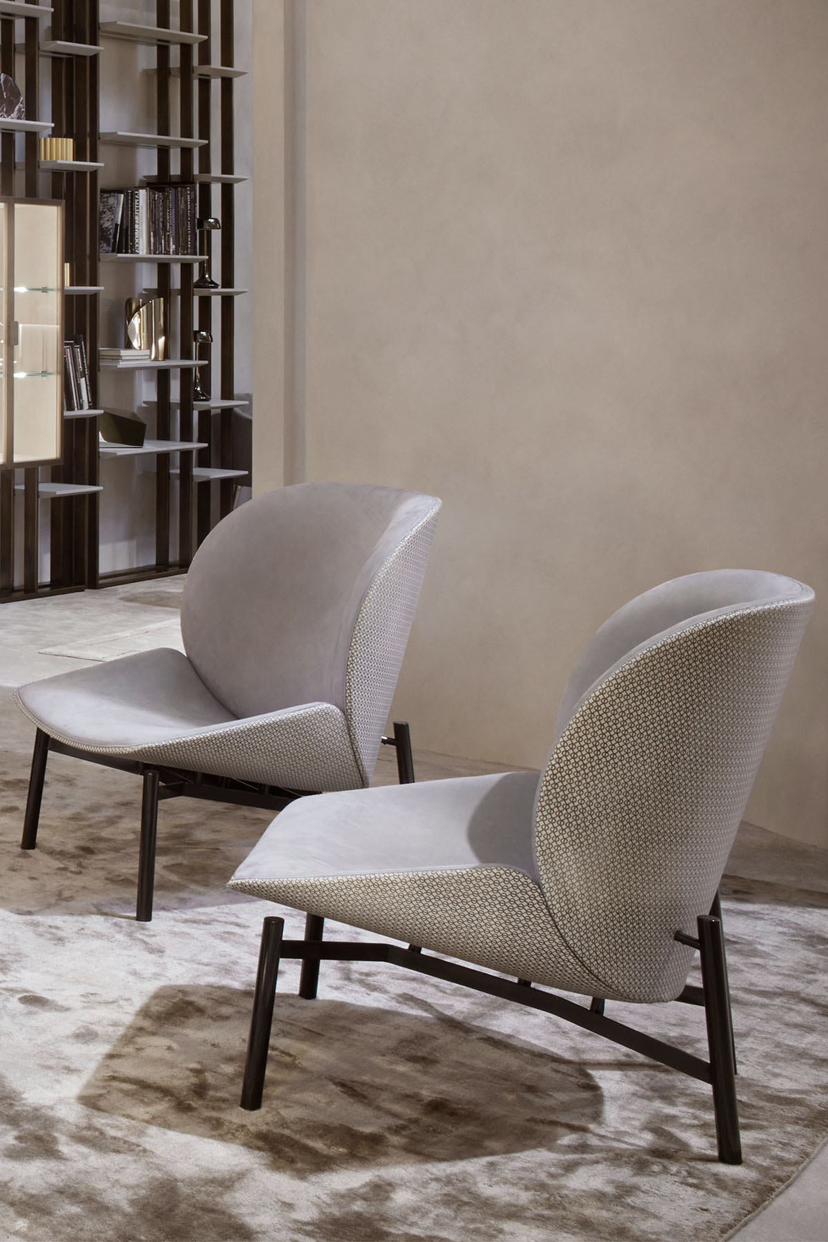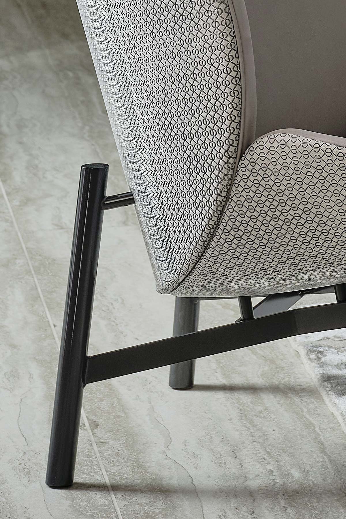 Armchair upholstered in leather. It features a double frame and a structure in satin gold or black chrome.