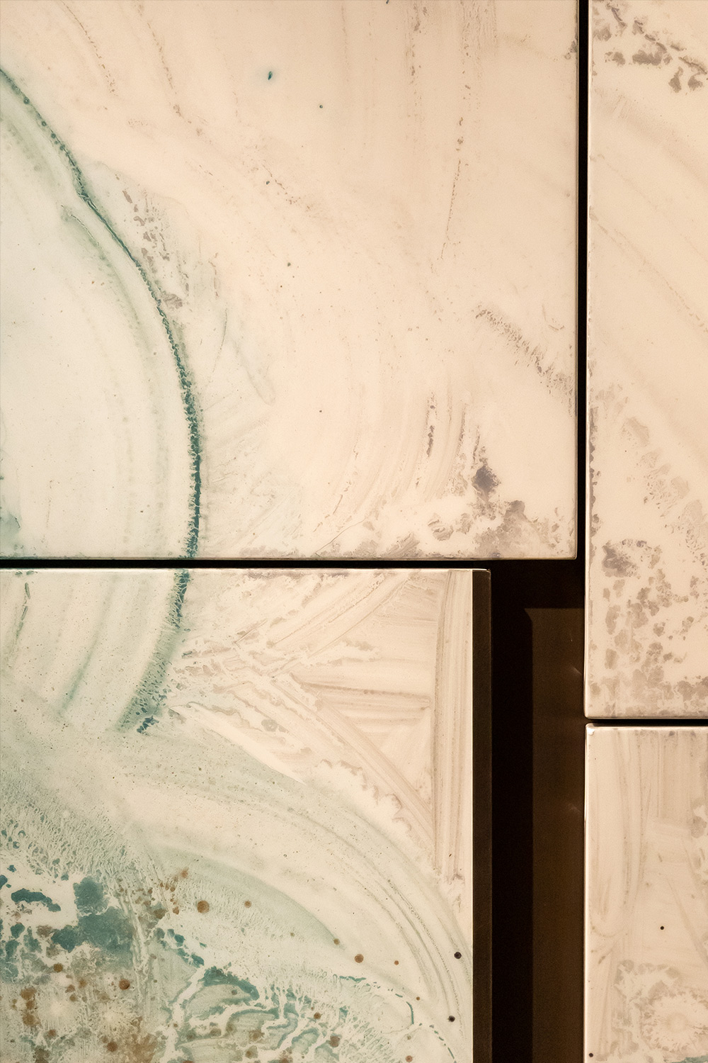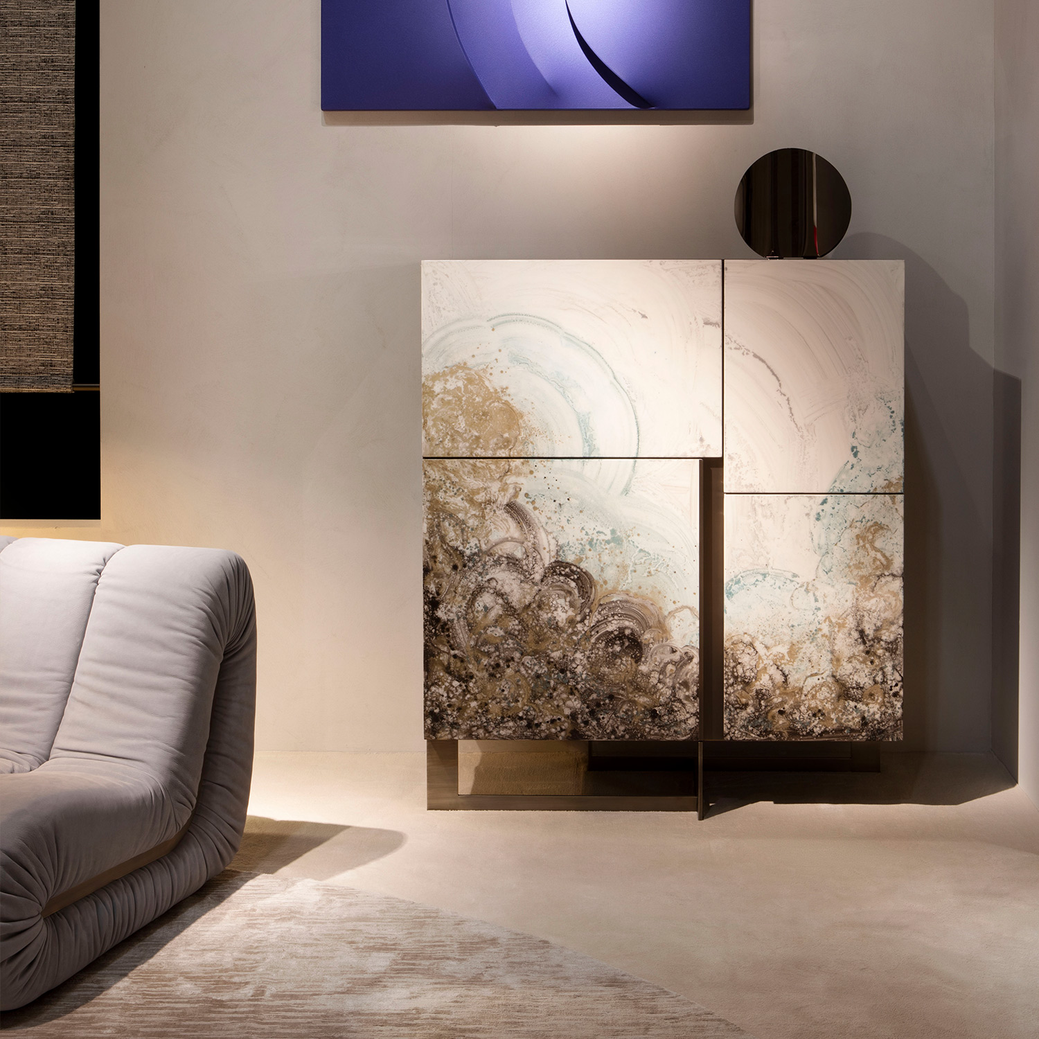 Its sculptural presence is enhanced by the possibility to customize the doors in three exclusive finishes: a refined wood veneer, an elegant leather upholstery, or a hand-decorated artistic version, where each surface is uniquely crafted by selected artists. This process makes every piece one of a kind, turning Blade into a true work of art.