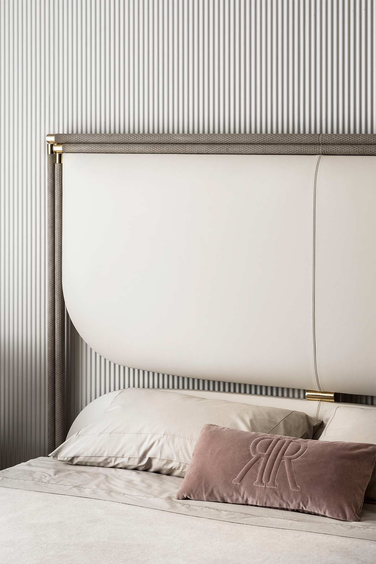 The Boheme bed stands out for its padded headboard, framed by a metal profile upholstered in smooth or embossed leather, emphasizing the clean lines and refined materiality. Polished brass or bronze details add a precious accent that enhances the soft tones and generous volumes of the upholstery.