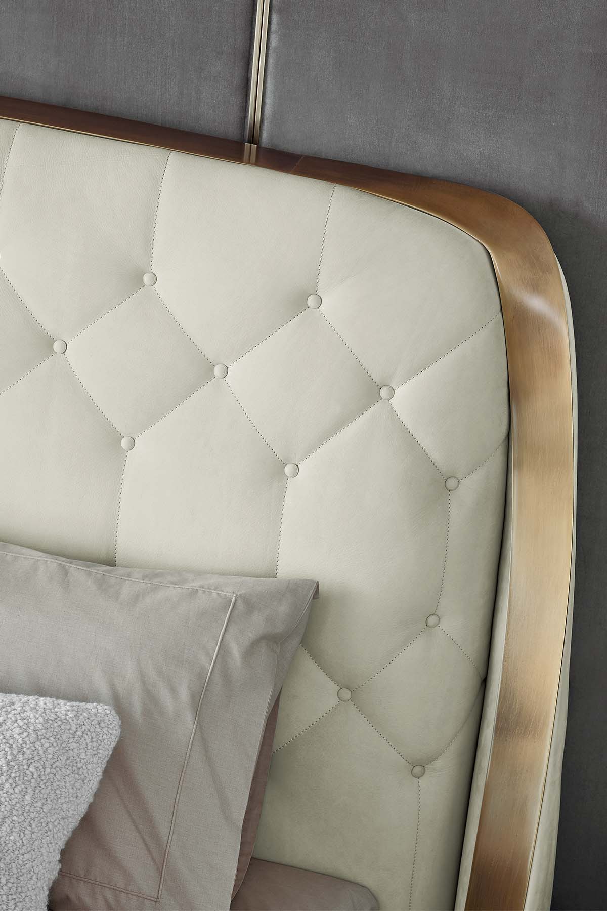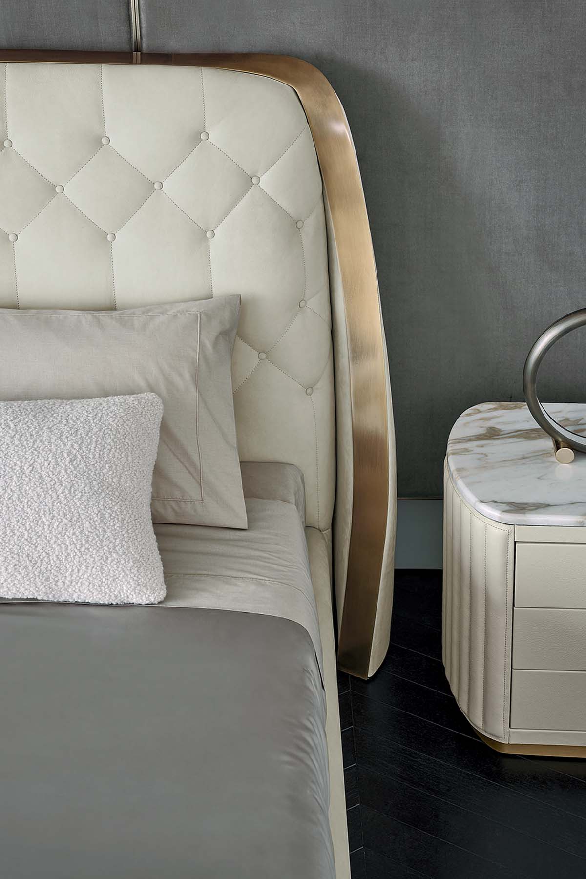 The Damassé bed reinterprets the elegant architecture of the Dama model, enriching it with the everlasting charm of capitonné detailing. The upholstered headboard, enhanced by a refined interplay of buttons and stitching, creates depth and visual rhythm, turning the wall into a scenic backdrop of timeless elegance. Framing the volume, a metallic structure envelops the headboard like a precious, luminous sign, highlighting the contrast between softness and architectural rigor.