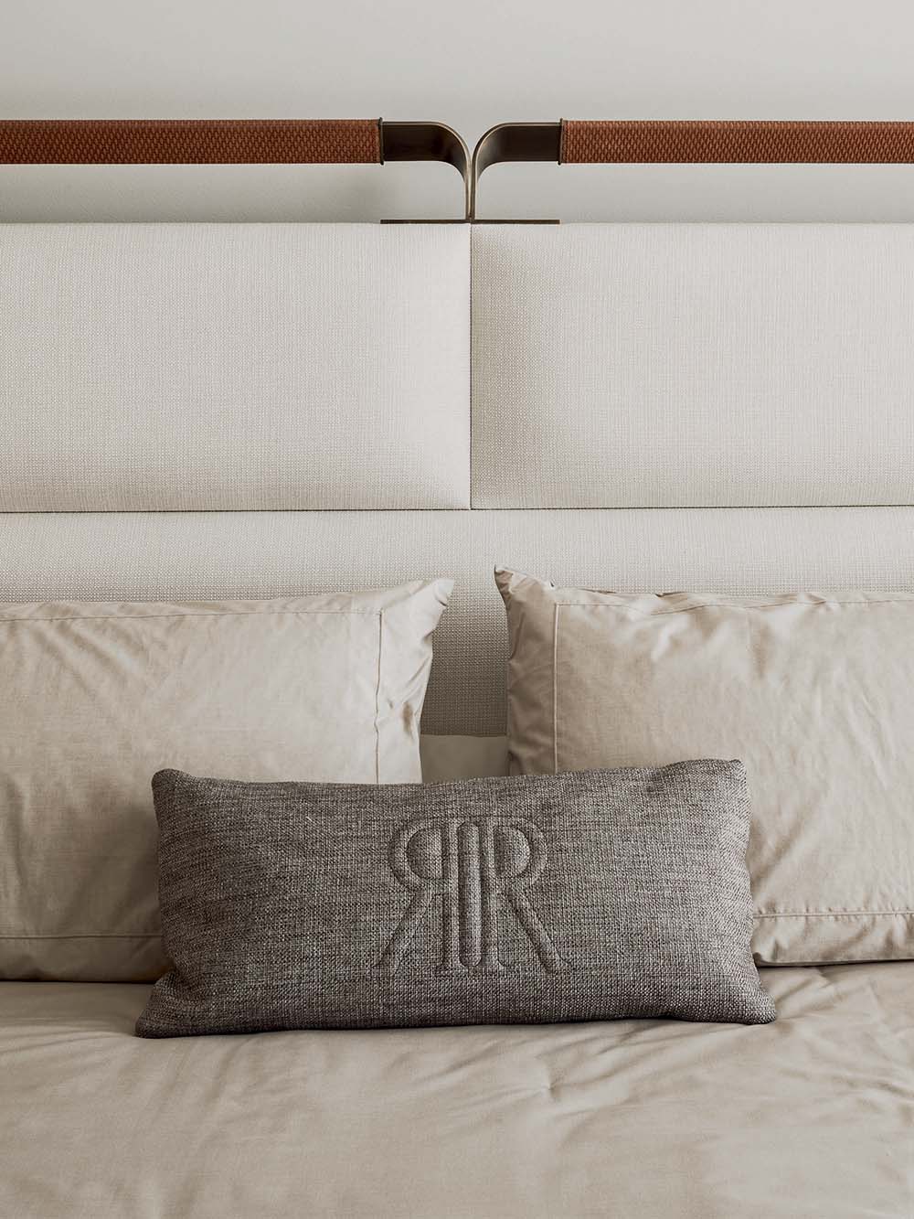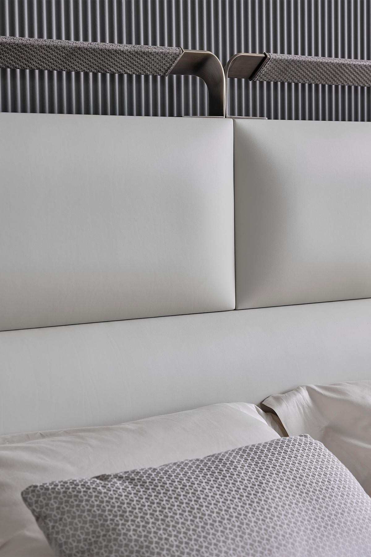 Bronze or brass details, positioned along the frame and in key points of the bed, introduce luminous accents that interact with the softness of the surfaces. A sophisticated contrast between materiality and light enriches the structure without weighing it down.
