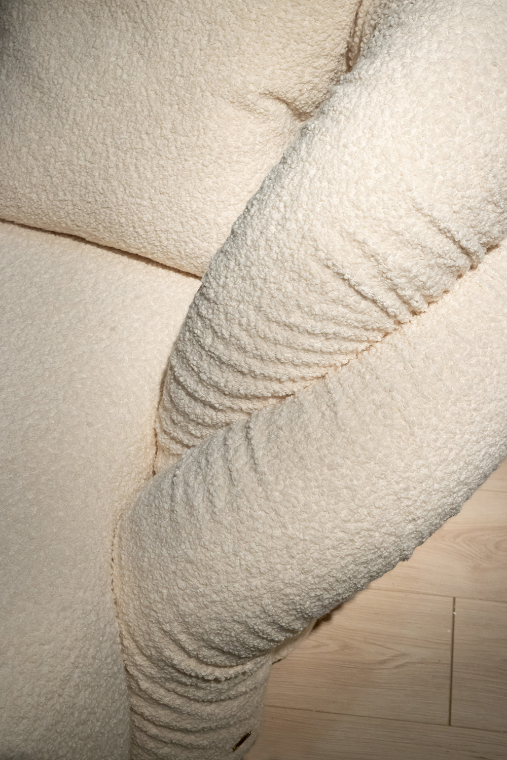 The Abbraccio chaise longue is the result of the encounter between sculptural form and ergonomic function. Its generous, sinuous lines define an extended and welcoming seat, completed by a backrest that intertwines like a protective and reassuring gesture—the distinctive signature of the entire collection. The continuity between volumes and padding creates a soft, harmonious visual language that invites total relaxation.