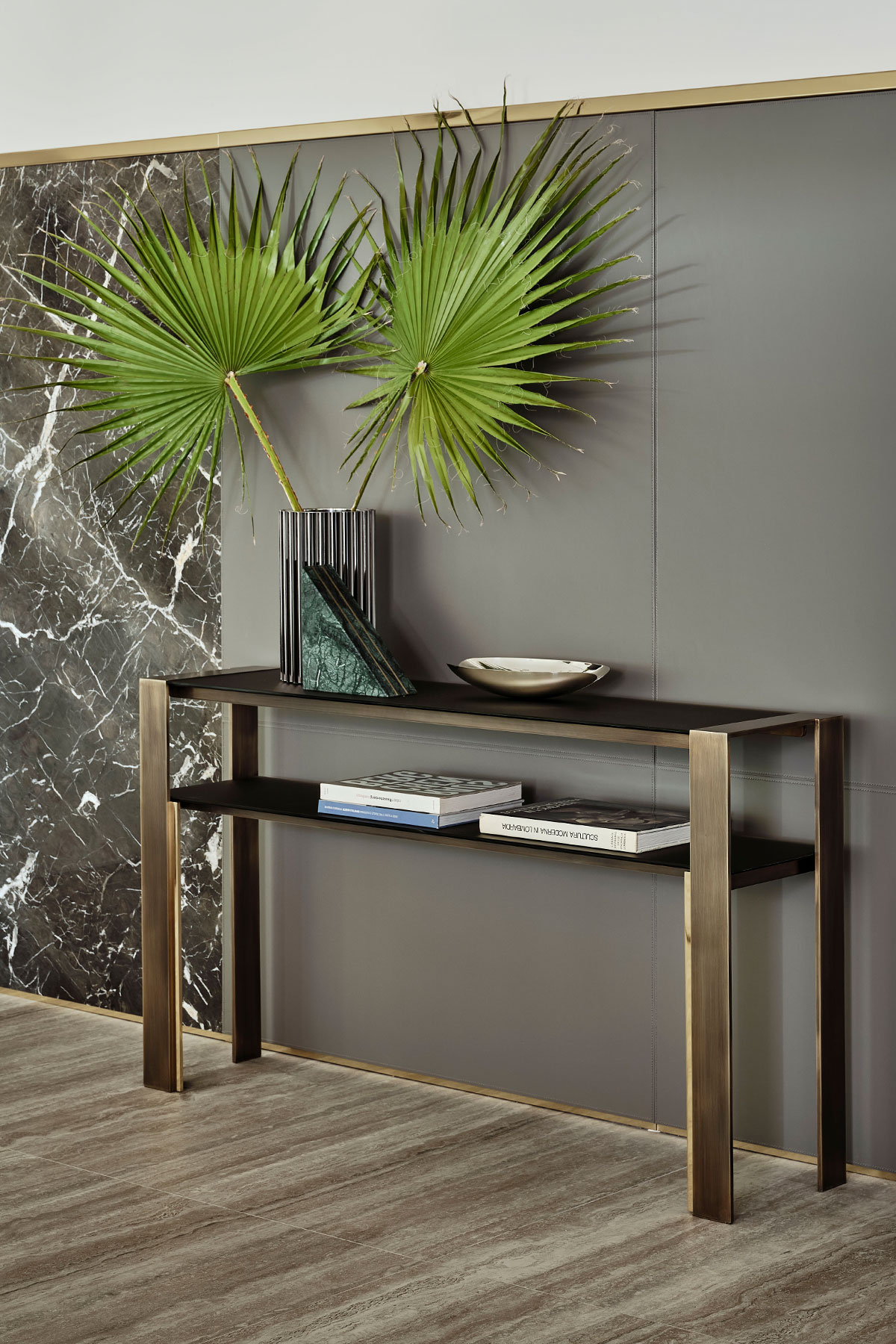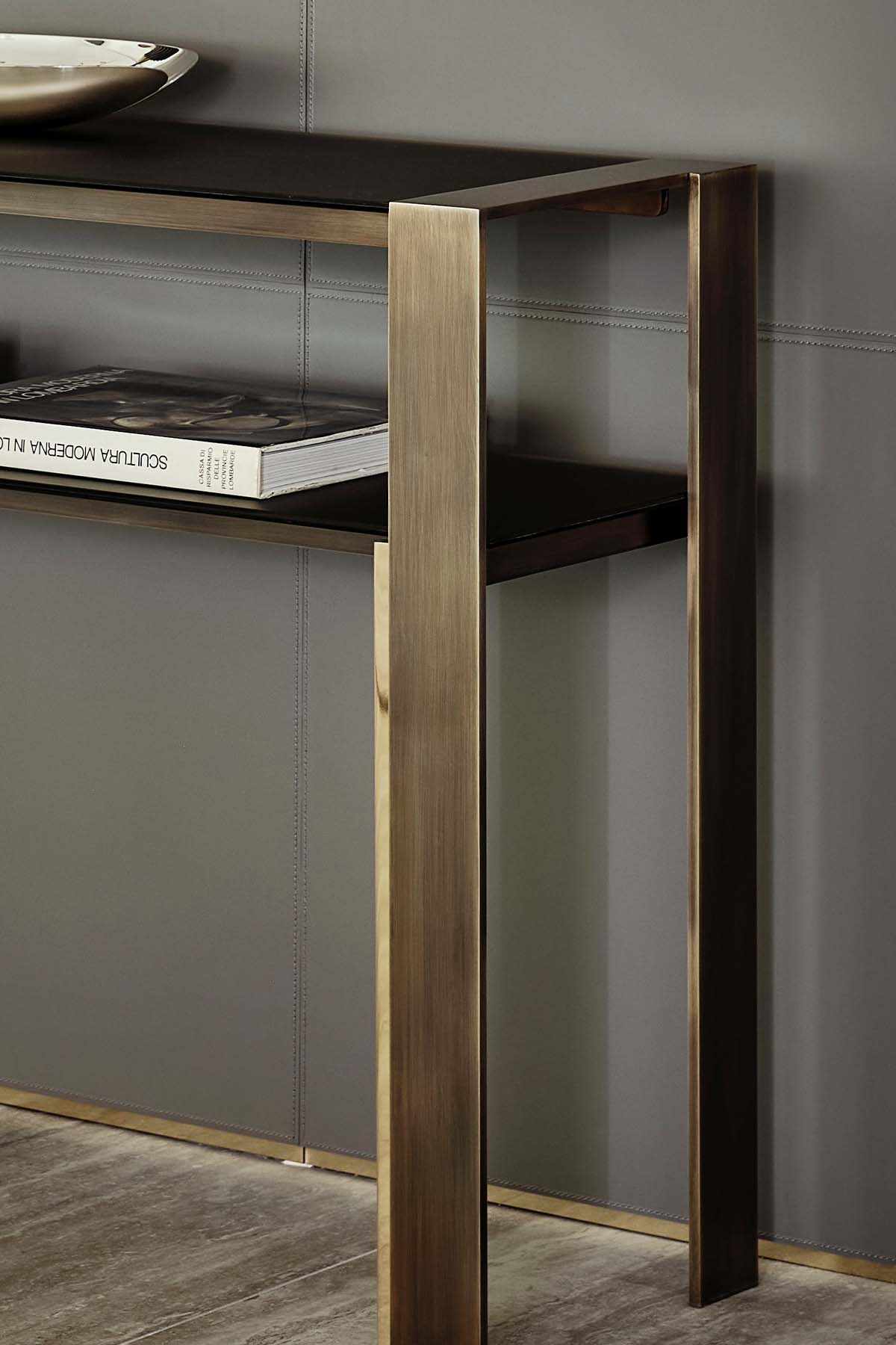 Clear cut and essential lines characterize this console, composed by two glass tops framed by the bronze structure.