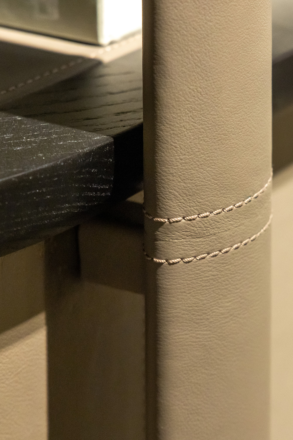 Each piece in the collection features a fully leather-clad structure, enhanced by exposed stitching that highlights its artisanal quality. The slim outer uprights are finished with bronze accents, adding a refined and distinctive touch. The bookcase, slender and airy, is equipped with wooden shelves that alternate open compartments with closed storage, providing versatile organization solutions.