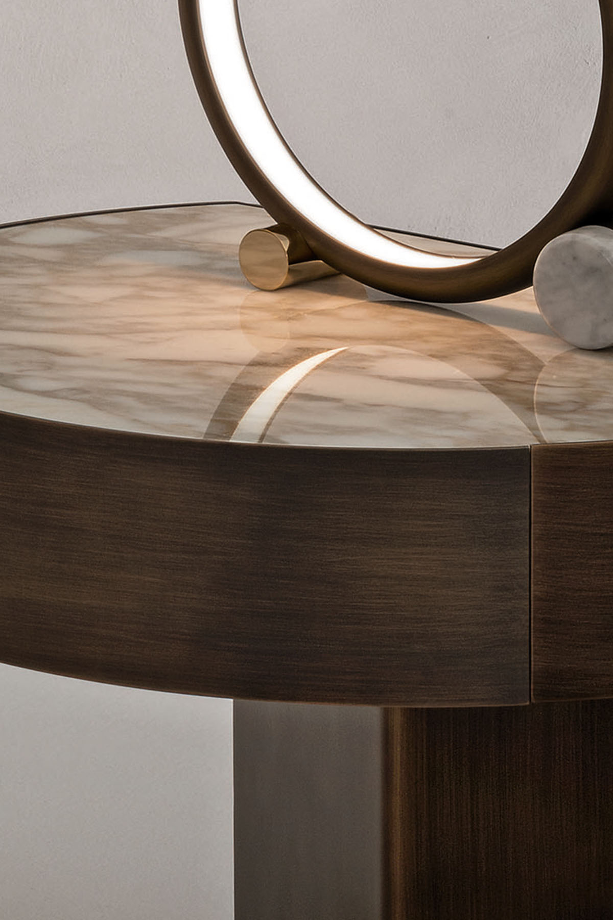 The Inca bedside table combines precious materials and finishes for a sober and elegant design capable of offering new aesthetic-functional solutions. Both elements, top and base, have rounded geometries that give a sense of solidity and yet lightness to t