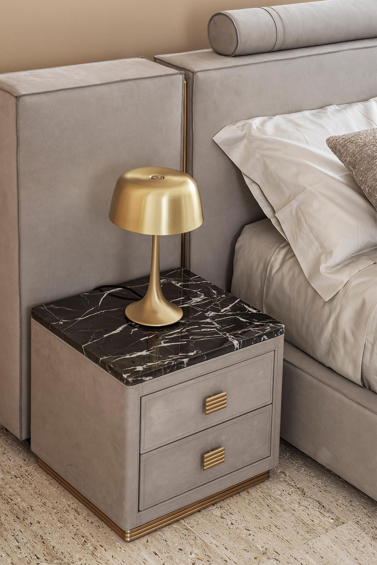 Range of 2 or 3 drawers bedside tables available in two different dimensions, upholstered in leather. Marble top and metal detailing.