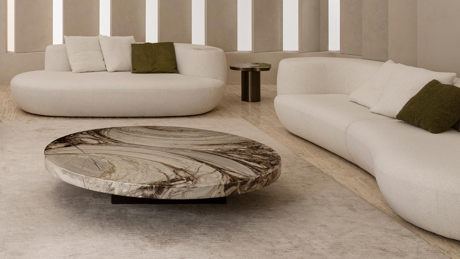 Offered in a two-piece modular version—left and right elements—Rafael allows for the creation of a spacious, monolithic seating arrangement that inhabits the room with understated sophistication. The enveloping design is enriched by refined details, such as the iconic natural marble insert set into the backrest: a distinctive gesture that elevates the material and makes each piece unique.