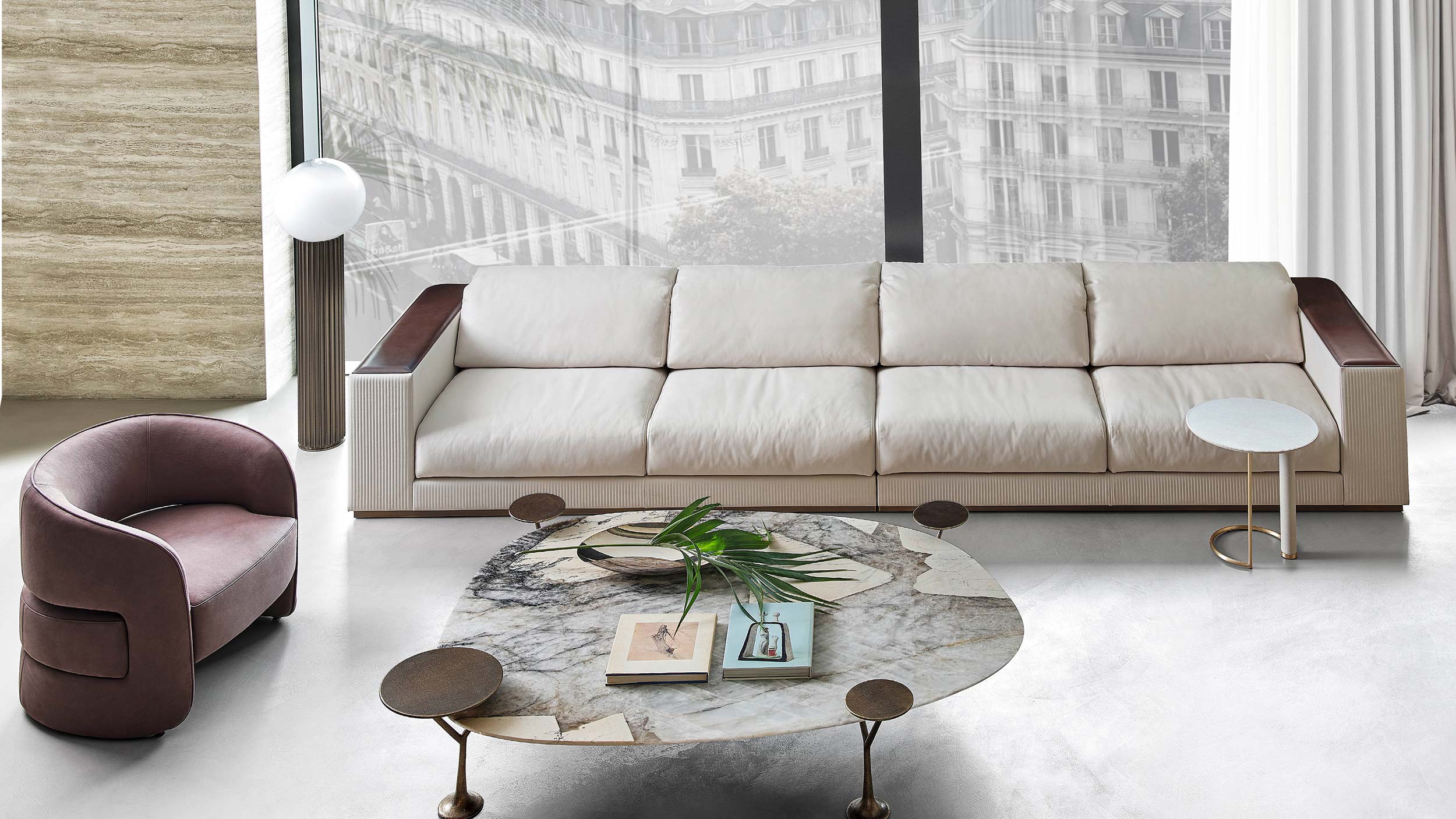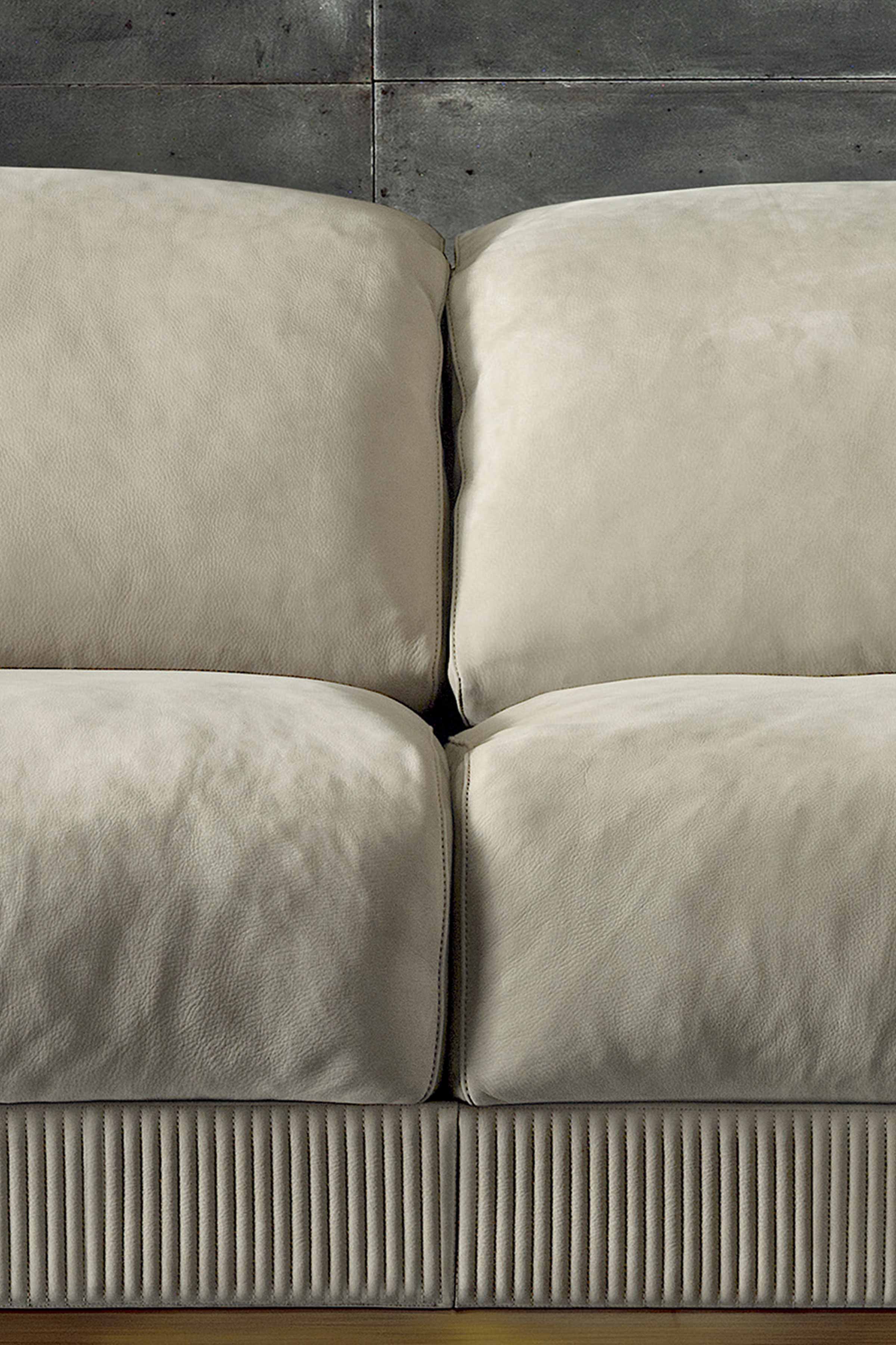 Range of modular upholstered furniture with saddle leather or nubuck detail. Structure available plain or with “baguette” stitching.