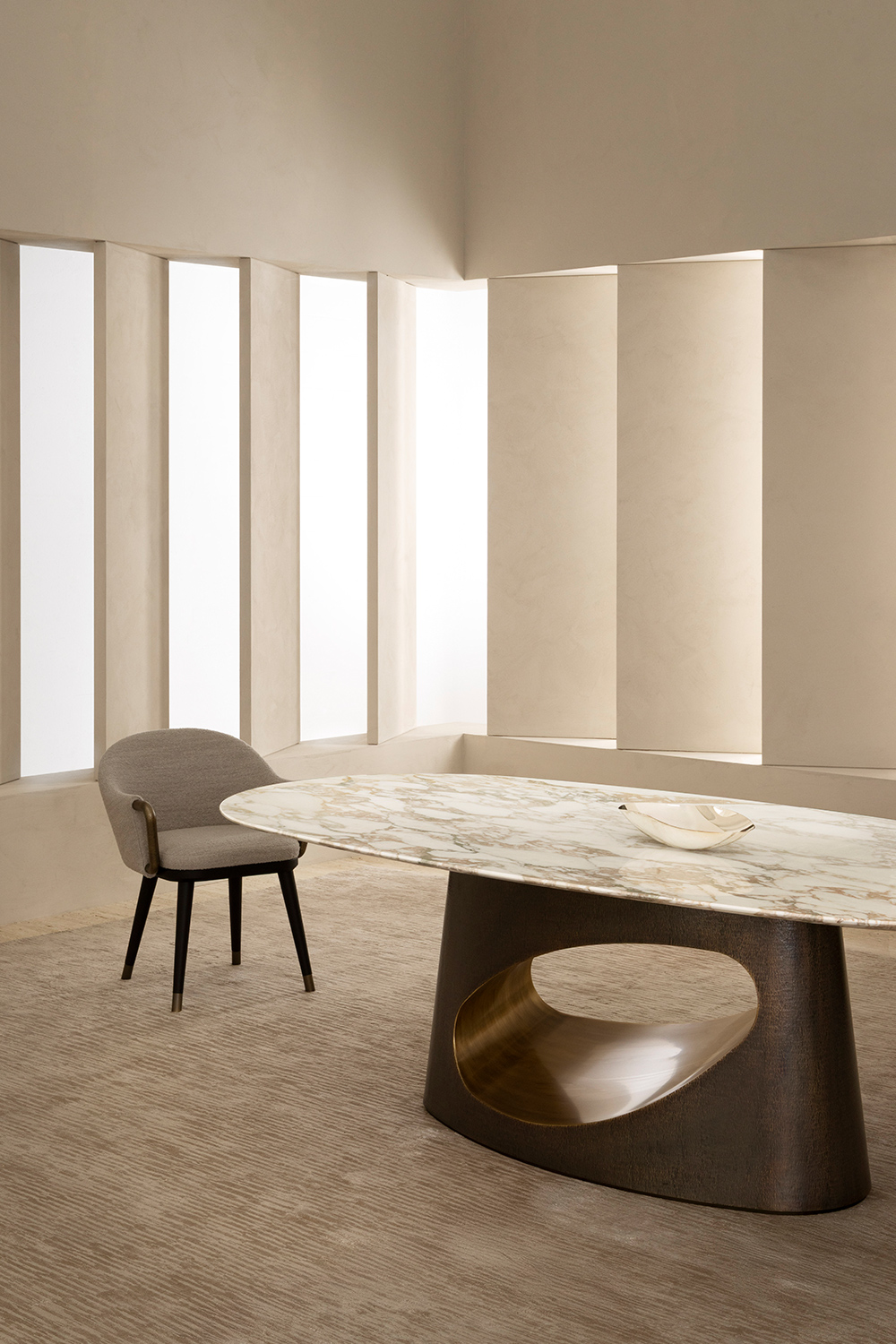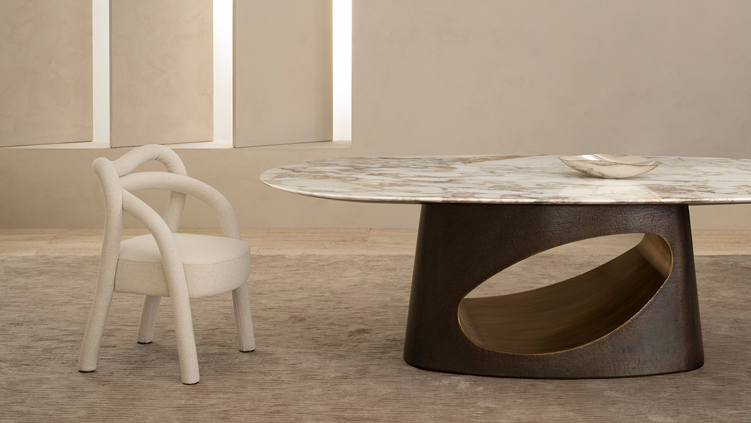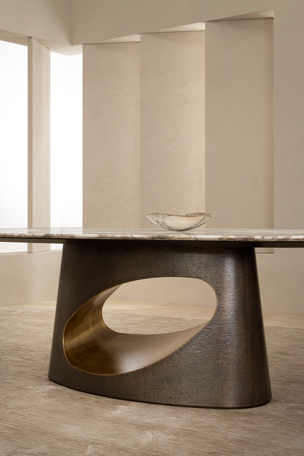 The Ring table makes a bold, sculptural statement, where the strength of metal meets the elegance of stone. The base, crafted in hand-hammered bronze-finished brass, stands out for its dynamic and architectural form: a solid volume carved by an oval opening that creates a play of light, shadow, and reflection—adding visual lightness to a monumental structure.