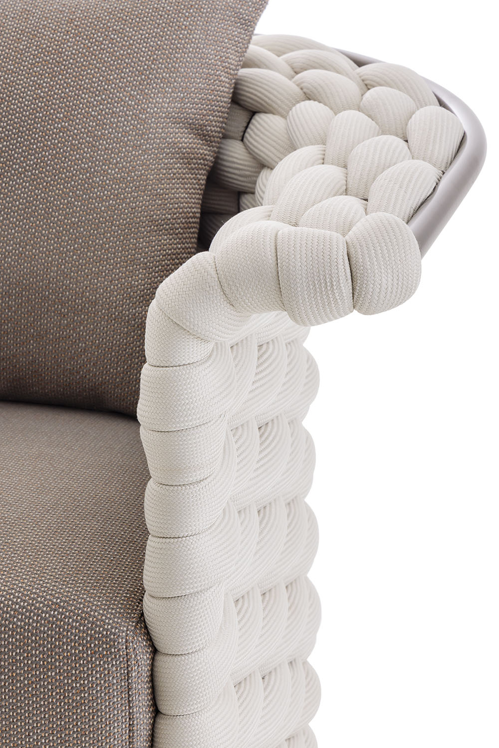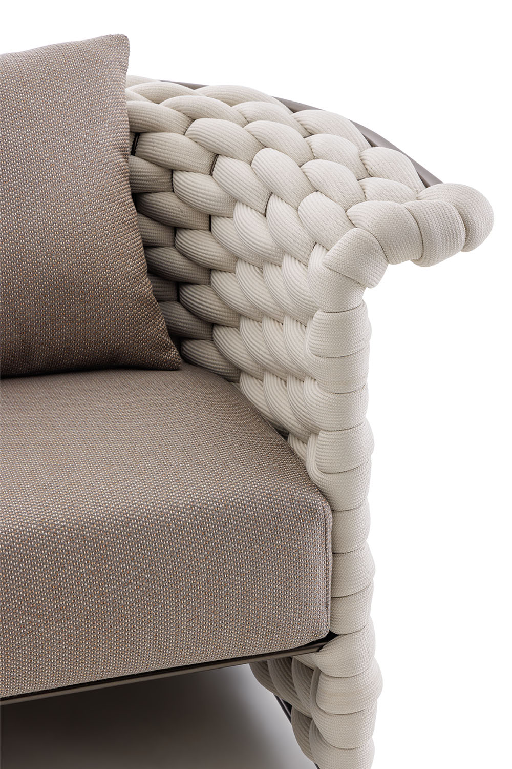 A compact yet generous volume designed to offer a deeply relaxing experience without sacrificing formal elegance. The padded tubular element, hand-woven in a seamless and fluid design, forms a sculptural yet inviting structure that embraces the seat and backrest with exceptional softness.