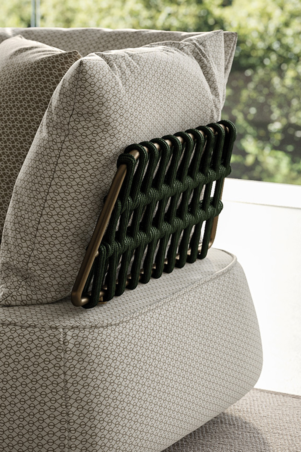 The bronze-painted aluminum frame supports a low, enhanced by a dense and graphic rope weave—an unmistakable signature detail of the piece. The soft, voluminous cushions offer a natural invitation to unwind, enriching the sensory experience of open-air lounging.