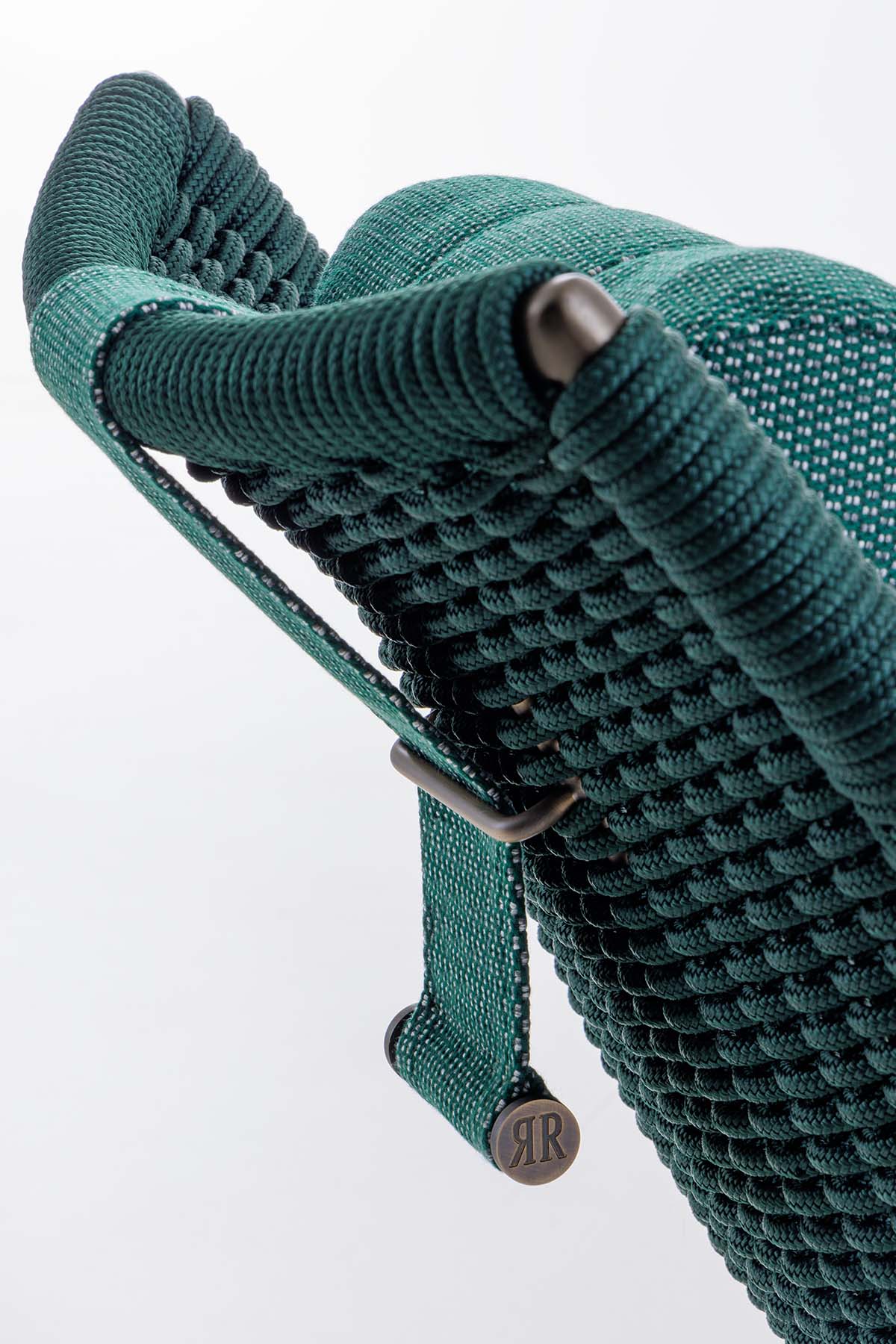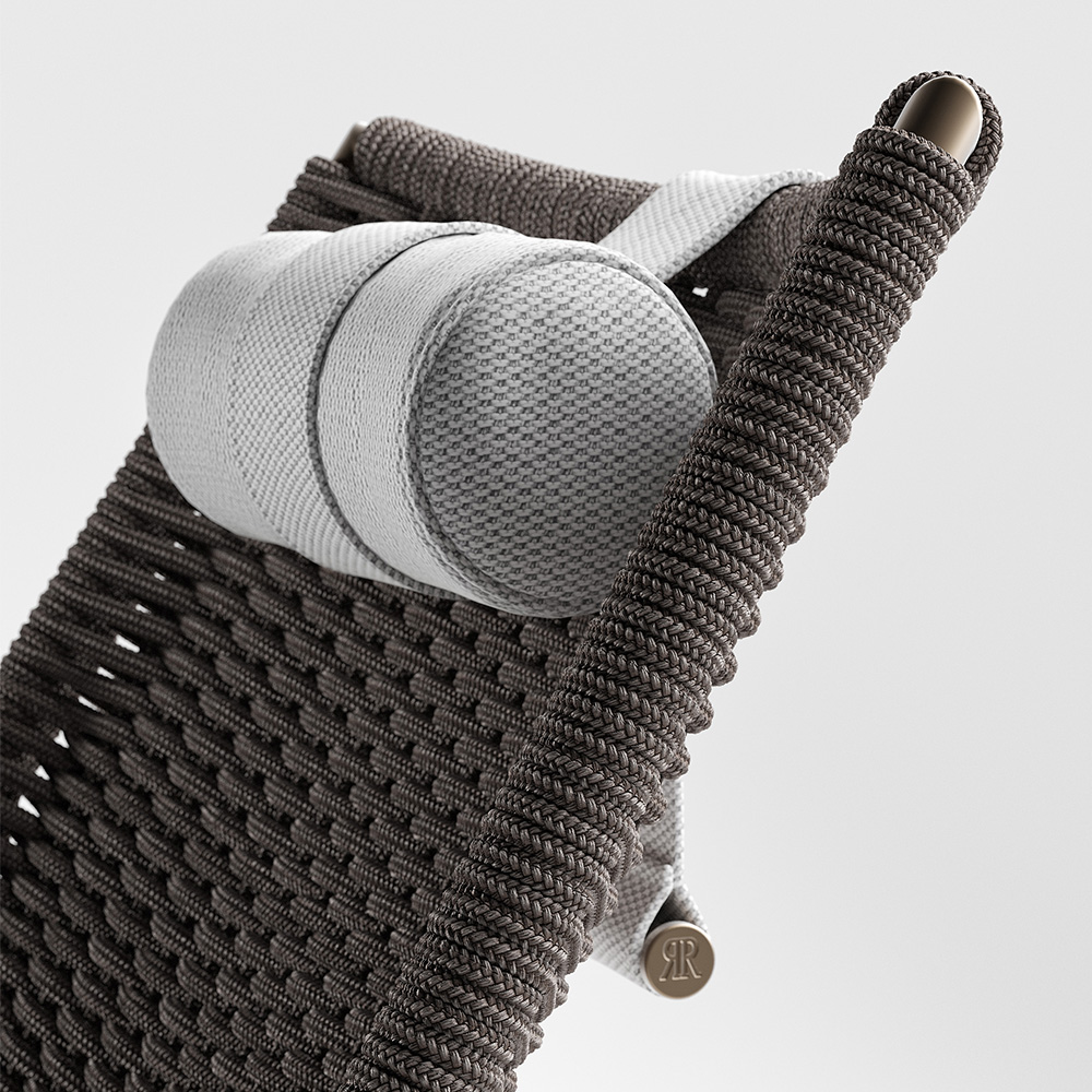 The frame, handwoven entirely in rope, rests on a bronze outdoor aluminum base and embodies the artisanal craftsmanship that defines Rugiano. Every detail, from the reclined backrest to the rhythm of the weave, is crafted to deliver an immersive comfort experience with visual lightness.