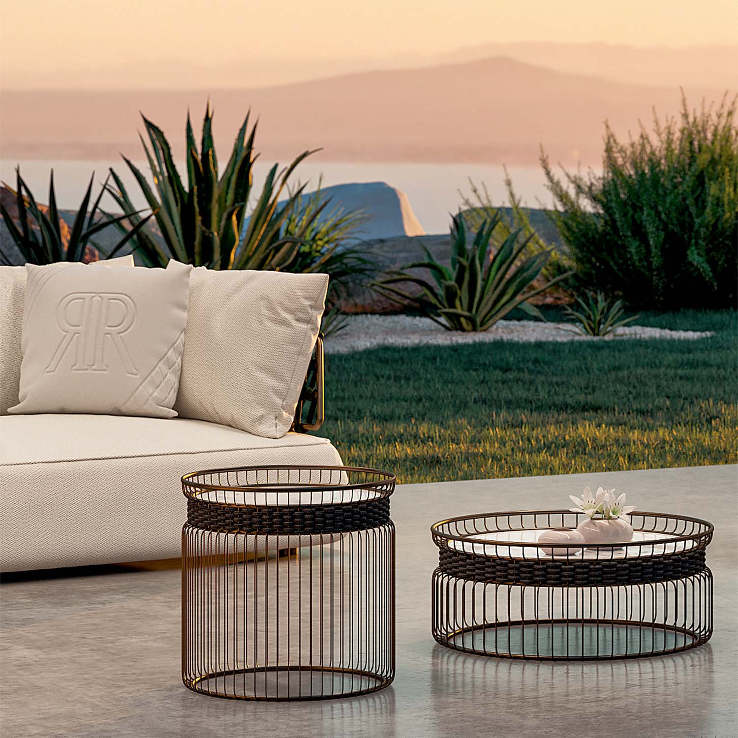 With its outdoor bronze aluminum structure made of slender vertical rods, the Ciglia coffee table defines an airy and sculptural volume, bringing a touch of architectural elegance to any outdoor space. Its circular profile, both essential and bold, is marked by a rhythmic pattern that adds movement to the setting while preserving a refined visual lightness.