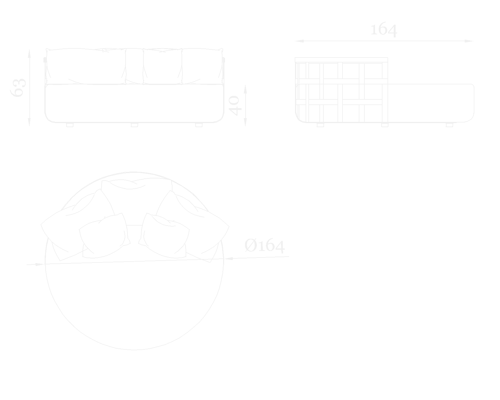 The Dafne Round pouf reinterprets the architectural elegance of the Dafne collection in a compact yet striking volume. Its soft, harmonious profile is framed by a structure in bronze outdoor aluminum, an element that echoes the formal codes of the collection and provides aesthetic continuity throughout the ensemble.