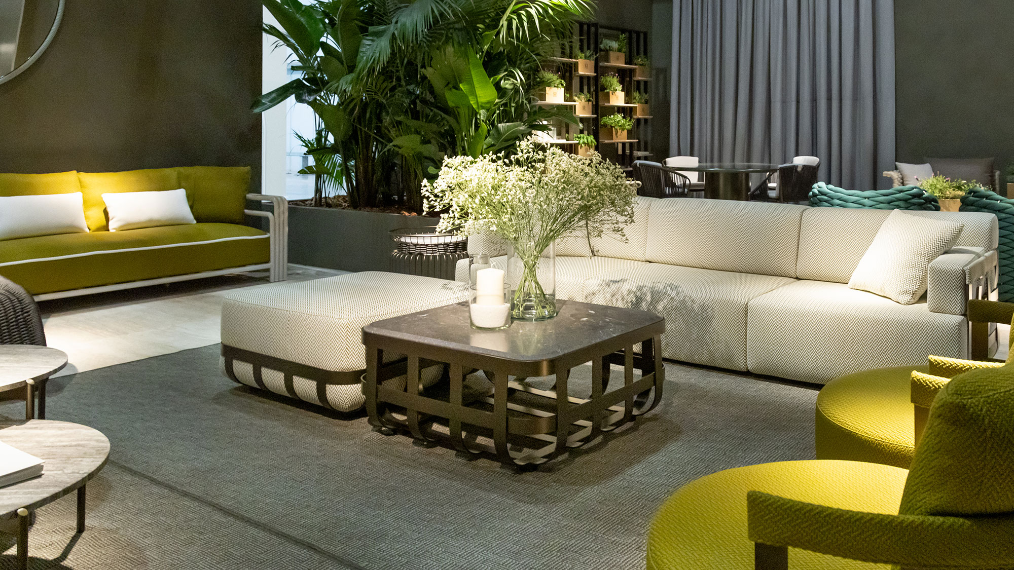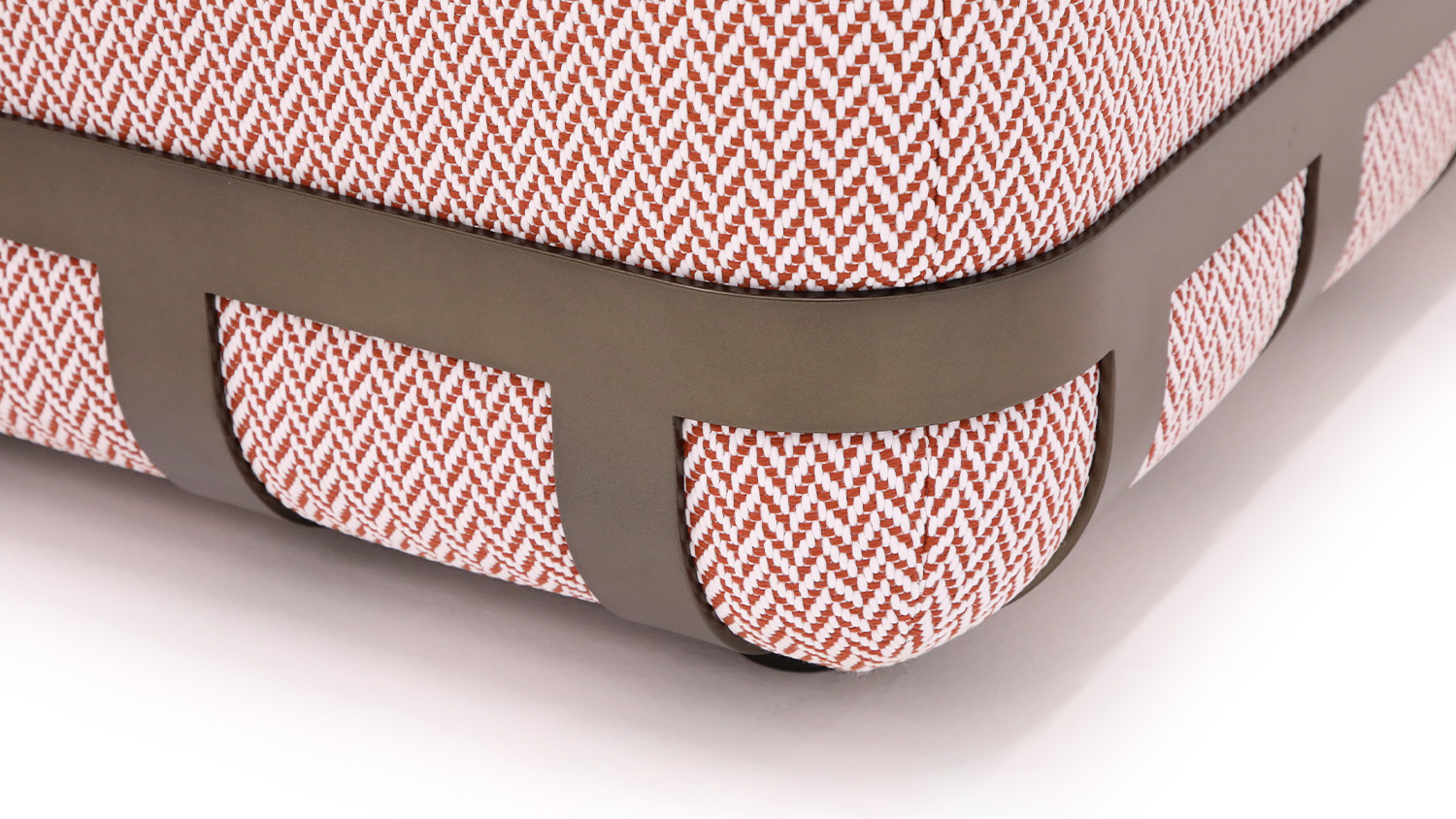 Metallic bands, arranged in a graphic rhythm, wrap around the upholstered seat, creating a balance between material richness and visual lightness. The generous and welcoming padding makes it the perfect complement to enhance open-air lounges, terraces, or exclusive outdoor settings.