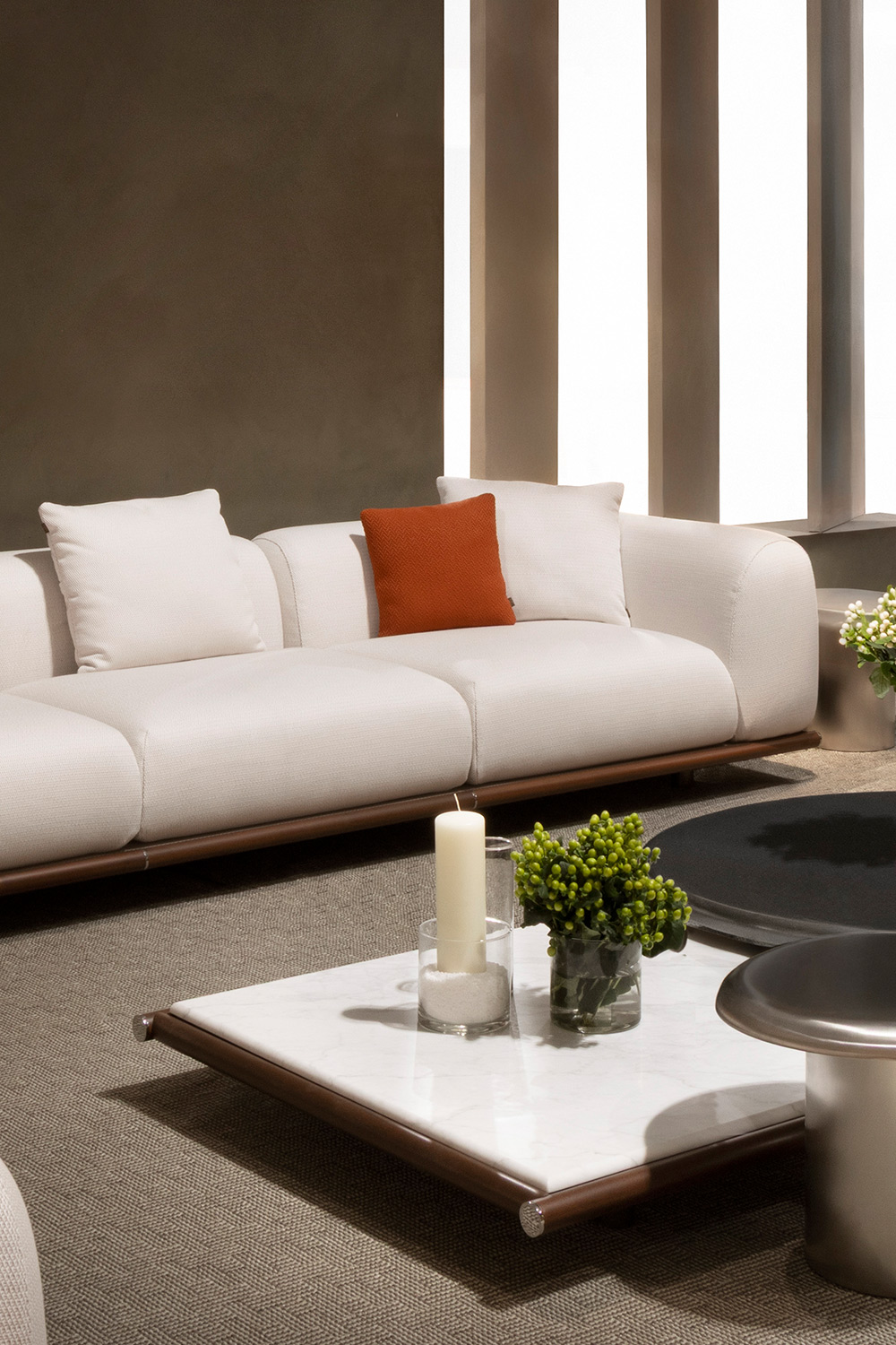Amalfi is the sofa that redefines contemporary outdoor living, with generous volumes and a clean, essential aesthetic designed to harmonize with its surroundings — discreet yet assertive. Its soft, monolithic lines rest on a solid mahogany base, enriched by chrome-finished details that gently reflect natural light.