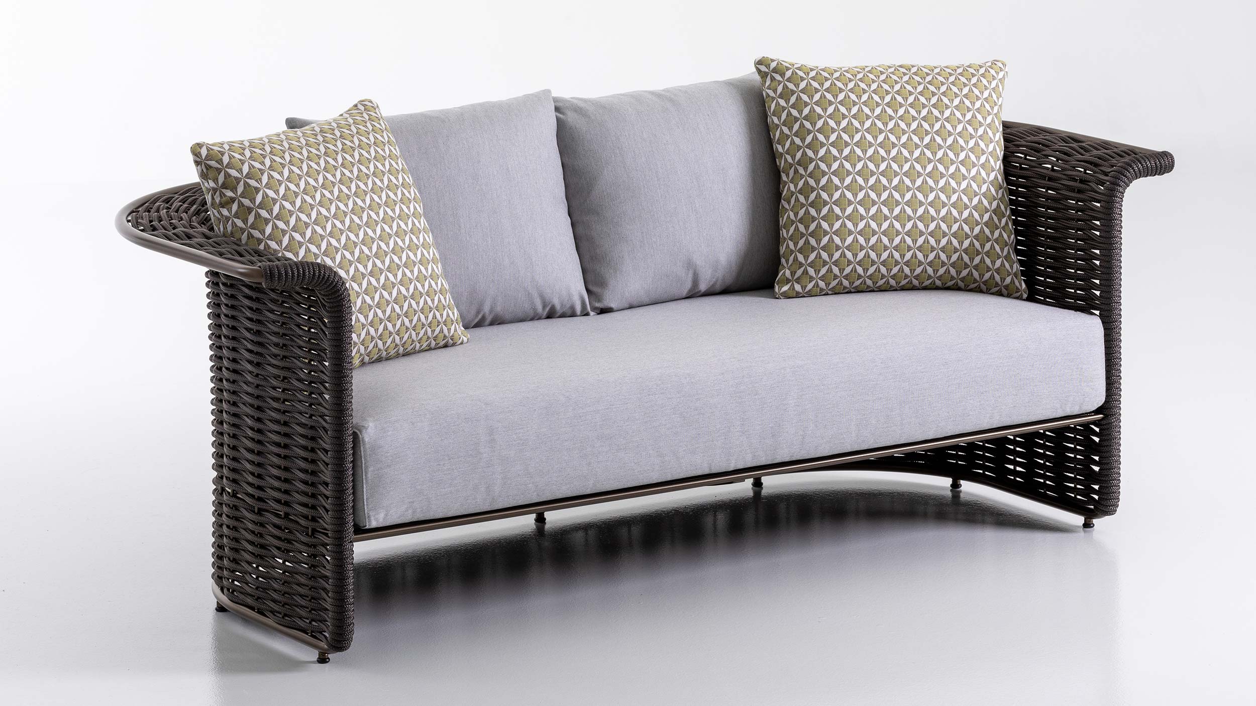 The Marina sofa embodies a refined vision of outdoor living, where comfort blends seamlessly with artisanal quality. The bronze outdoor metal frame, sturdy yet visually light, is wrapped in a hand-woven rope that defines its silhouette with a soft and continuous rhythm.