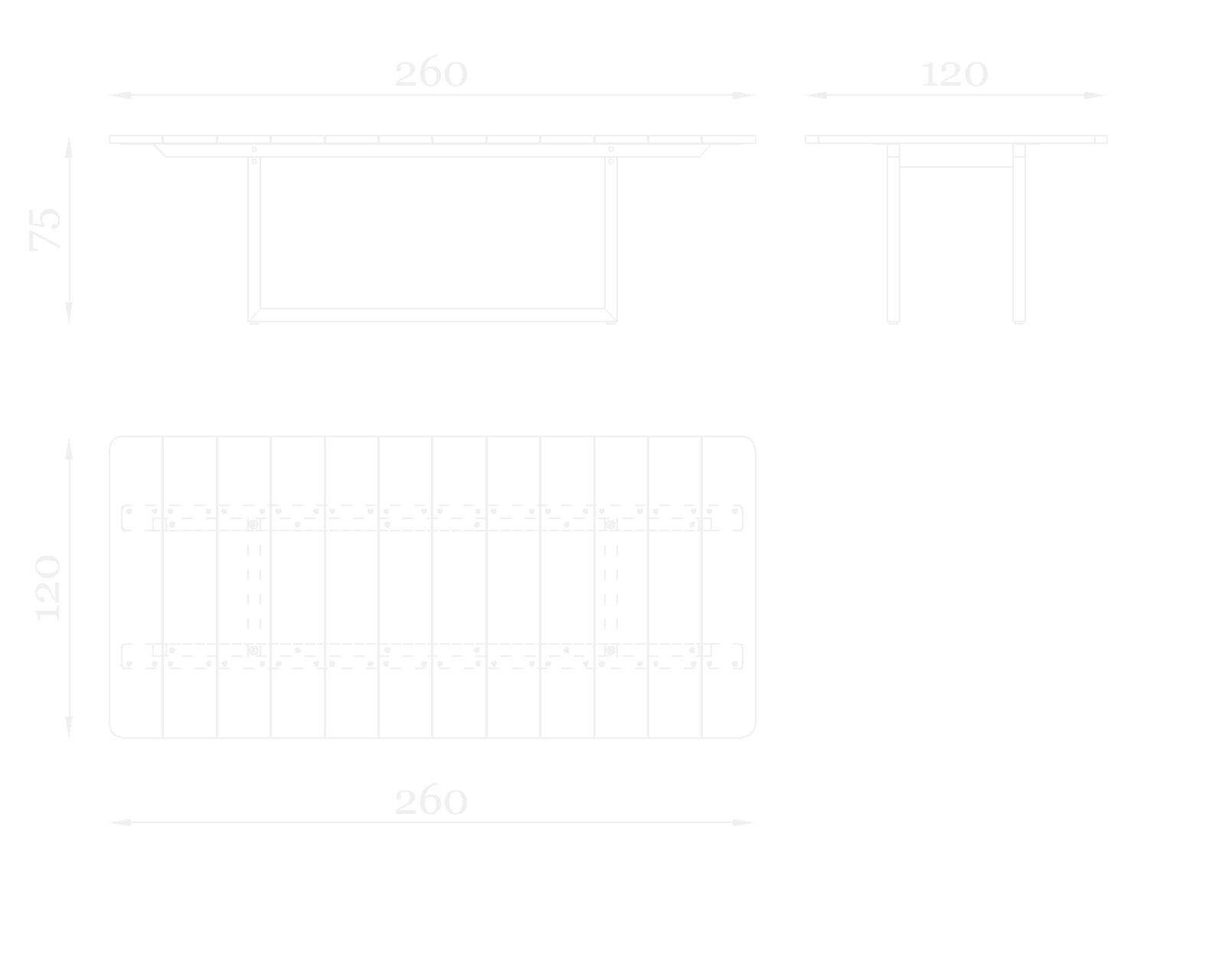 Its design relies on clean volumes and rigorous proportions, where every element is stripped down to the essential—without losing expressive strength. The geometric base in outdoor bronze-finished steel supports a top composed of evenly spaced slats in stone or wood, depending on the configuration. The modular, measured yet fluid layout creates a continuous visual rhythm that integrates naturally into high-end residential or contract settings.