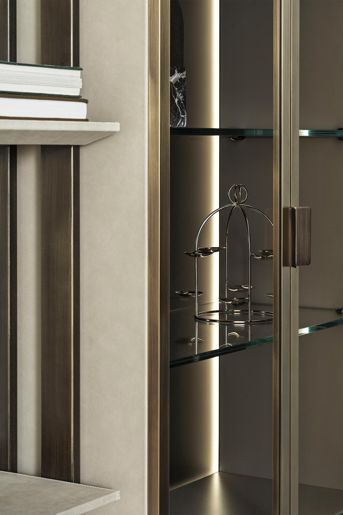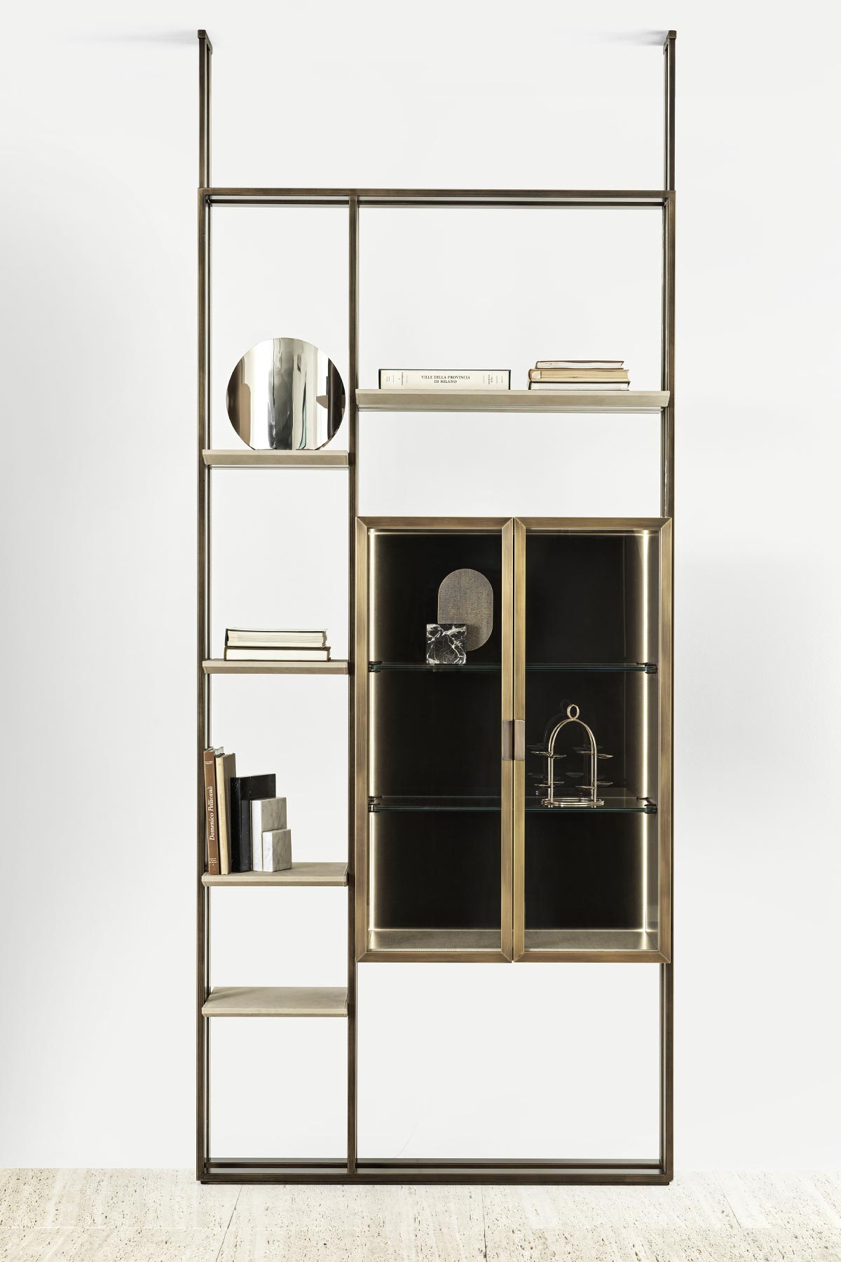 Librerie con montanti in bronzo verniciato o cromo nero, disponibili con quantità diverse di ripiani, rivestiti in pelle o in marmo e con l’aggiunta di box contetenitori anch’essi rivestiti in pelle con ante ricamate e con la possibilità di aver l’apertura