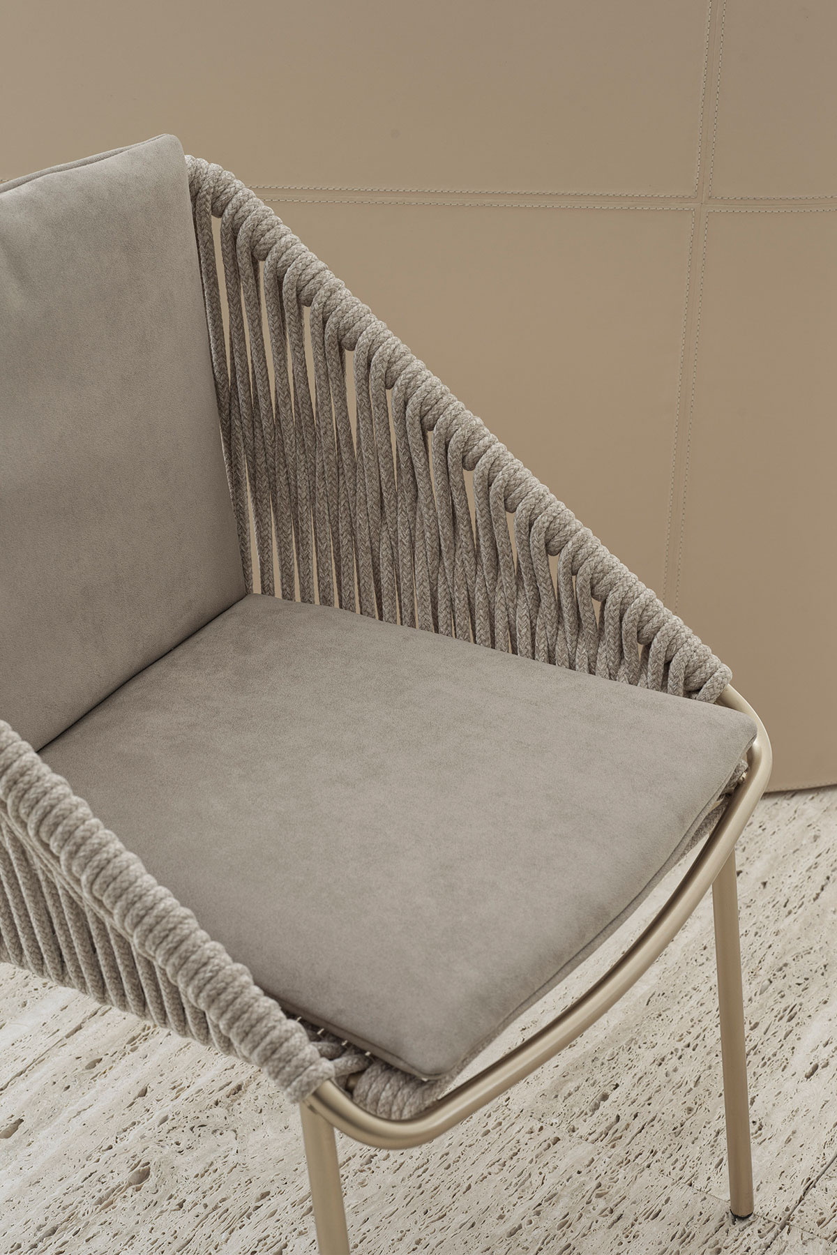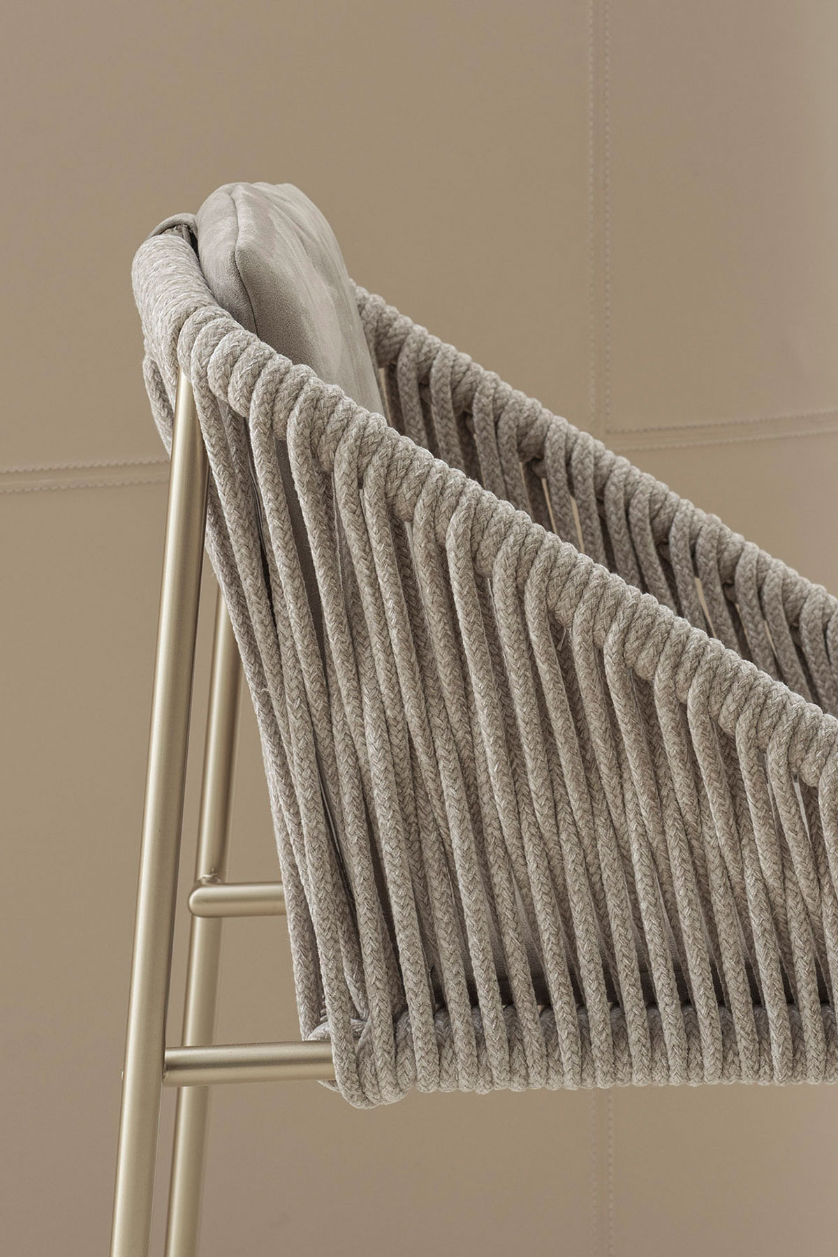 Collezione di sedute con caratteristici dettagli in corda di velluto. Comodi cuscini di seduta e schienale. Disponibile la sedia, la panca e lo sgabello.