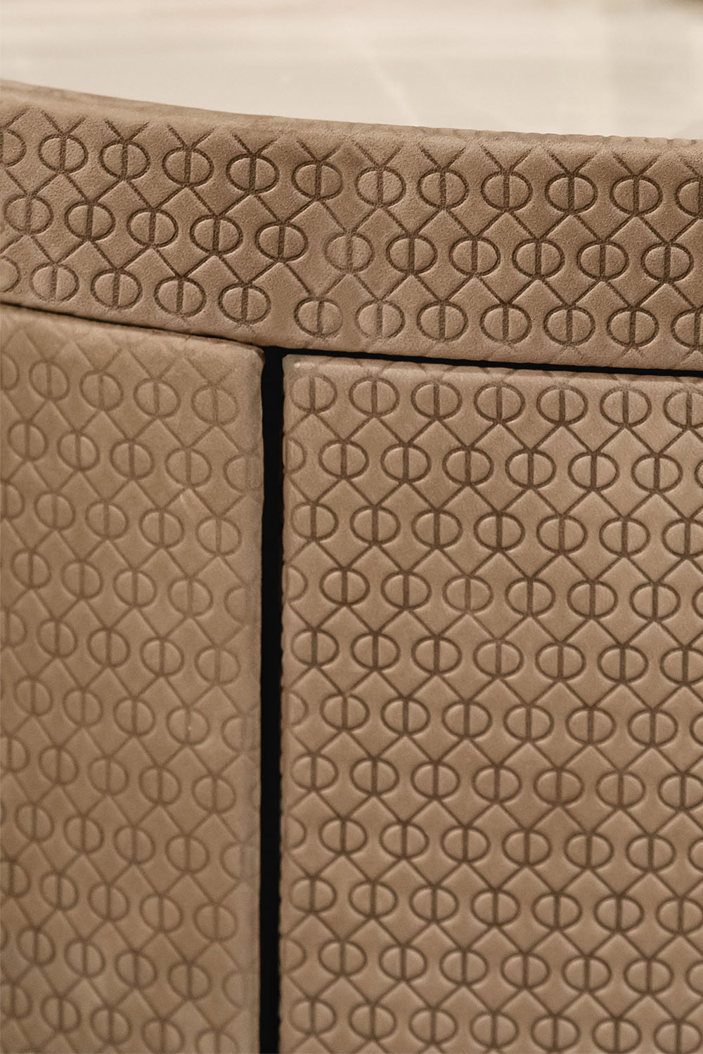 Il top, realizzato in marmo, aggiunge un tocco di preziosità naturale e si integra con la struttura rivestita interamente in pelle stampata. La texture, definita ma mai invadente, conferisce profondità visiva e arricchisce la superficie con un linguaggio raffinato, esaltando il carattere sartoriale del pezzo.