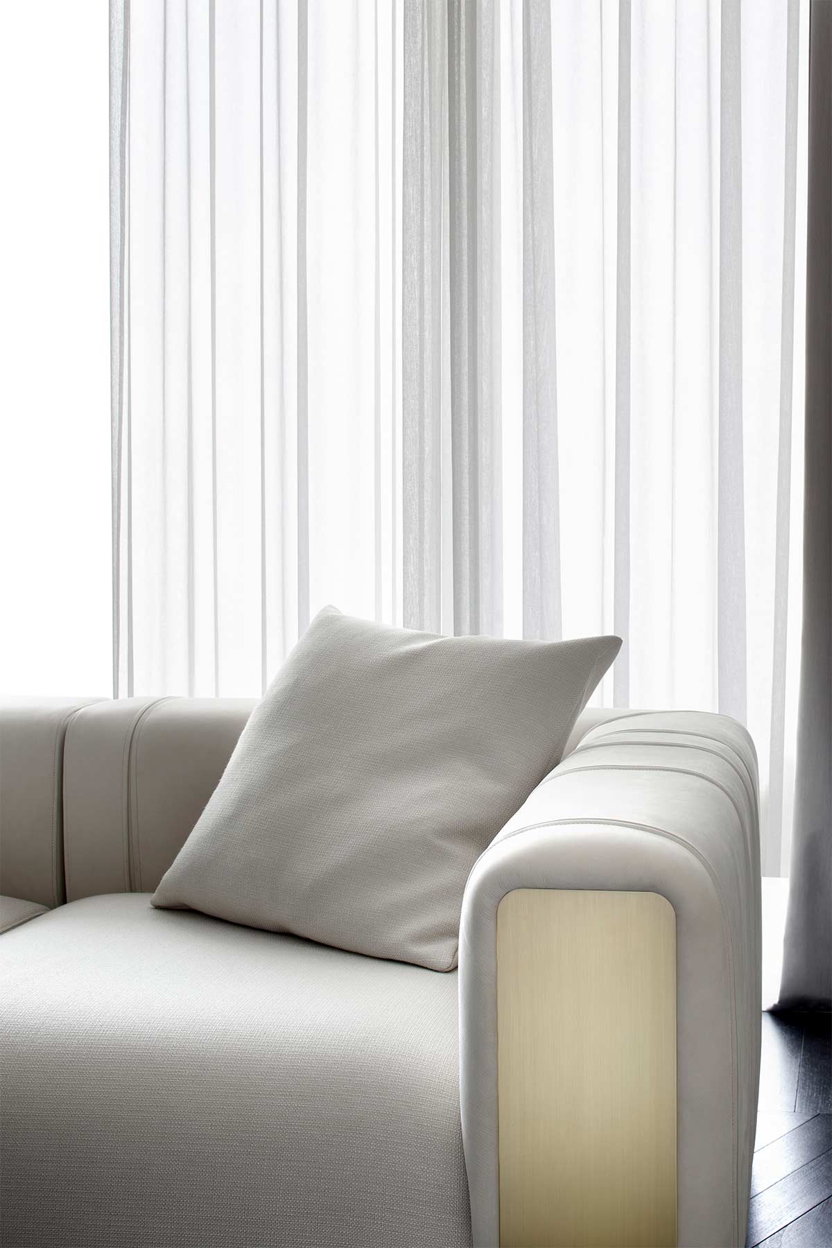 Collezione di imbottiti con dettaglio in ottone spazzolato sul bracciolo e una serie di plisse sullo schienale disposti in modo armonico.
