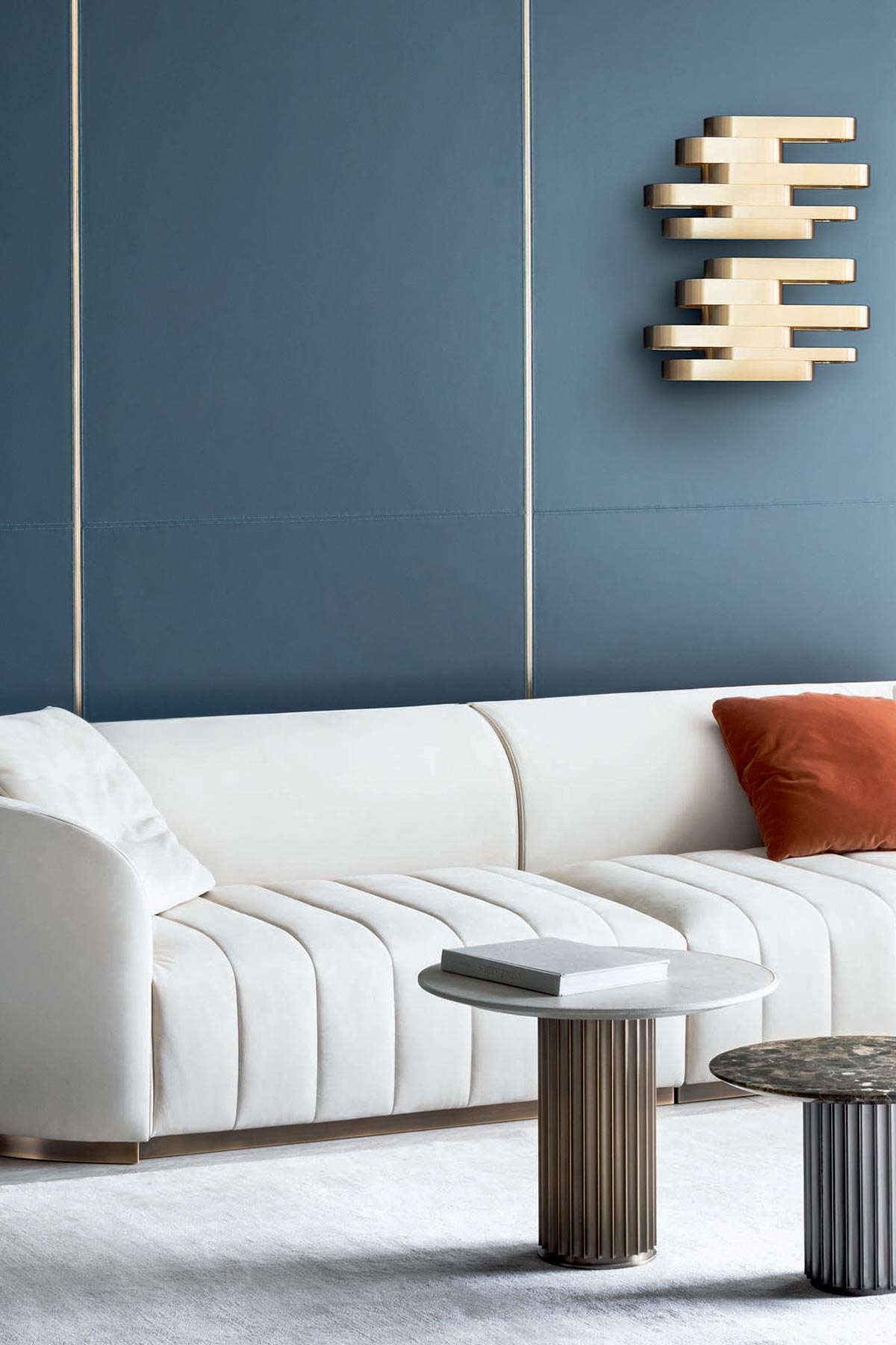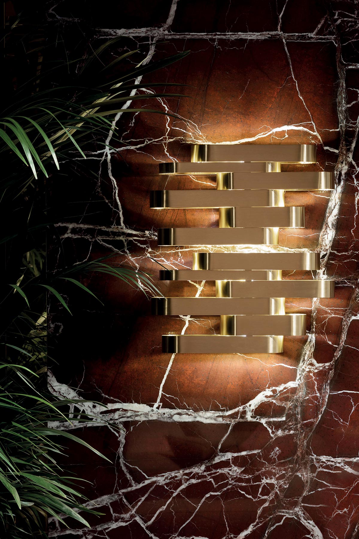 Ampia collezione di lampade in ottone, dalla sospensione alla lampada da tavolo. Forme lineari armoniosamente accostate.