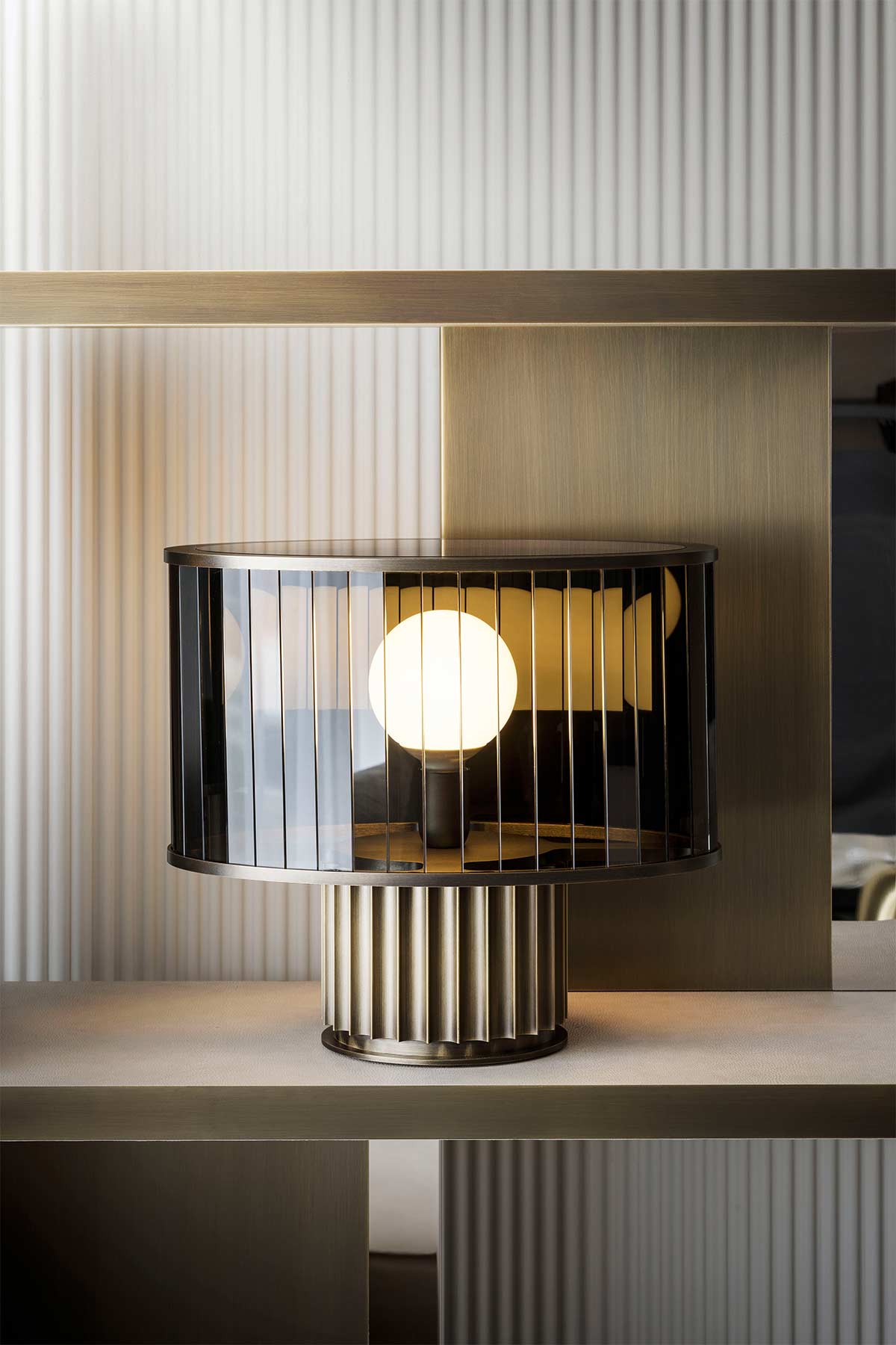 Collezione di lampade con base a colonna, un estruso in alluminio con finitura bronzo, cromo nero o oro lucido.