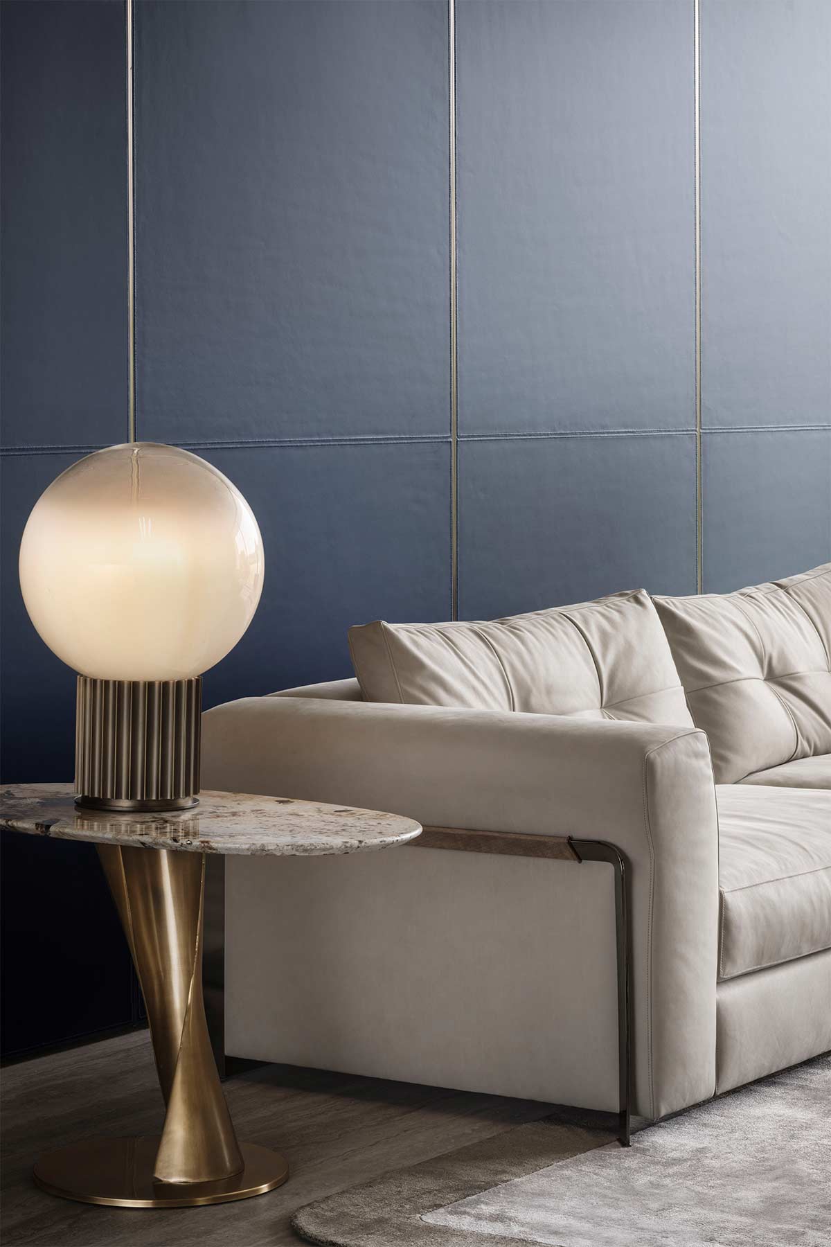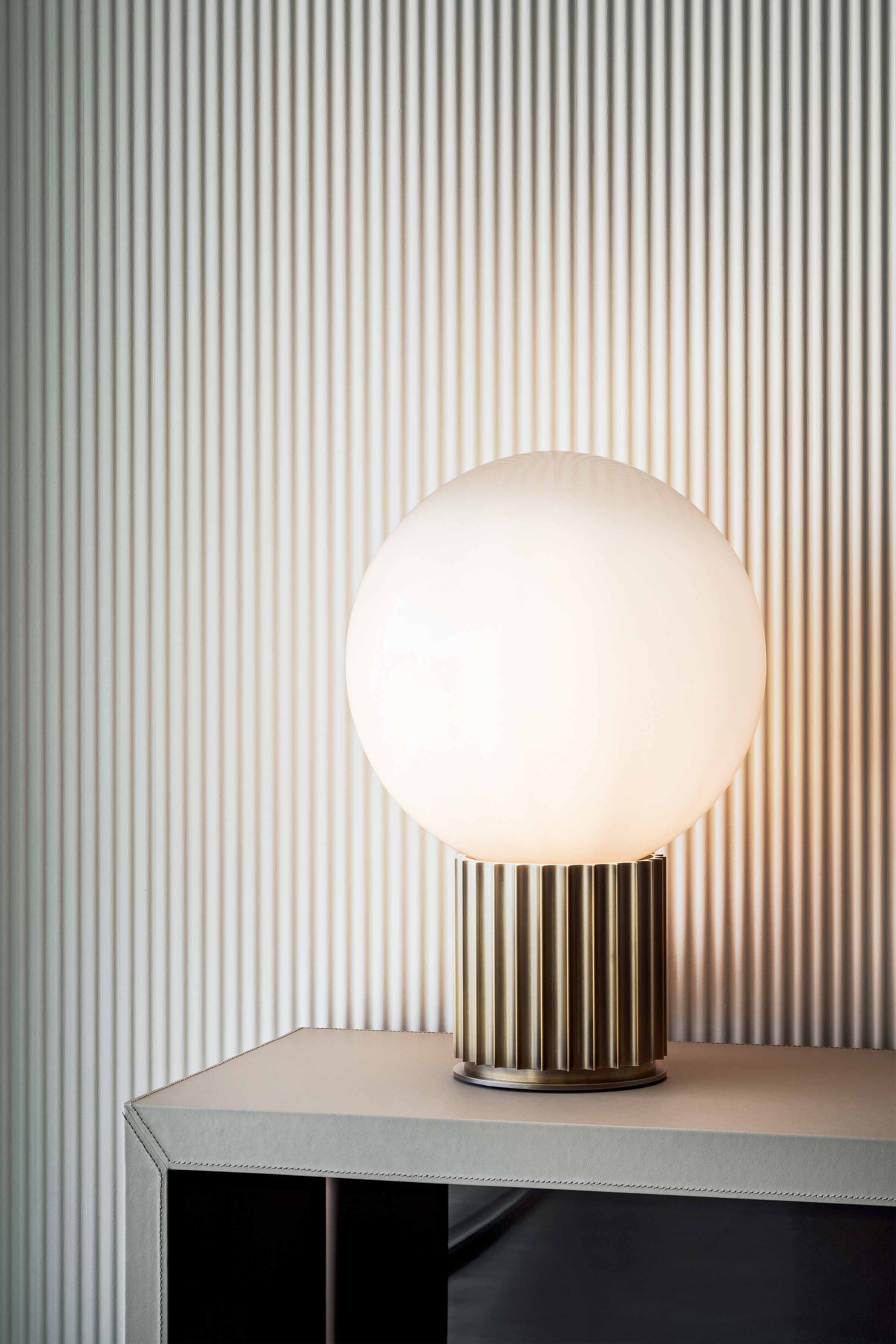 Collezione di lampade con base a colonna, un estruso in alluminio con finitura bronzo, cromo nero o oro lucido.