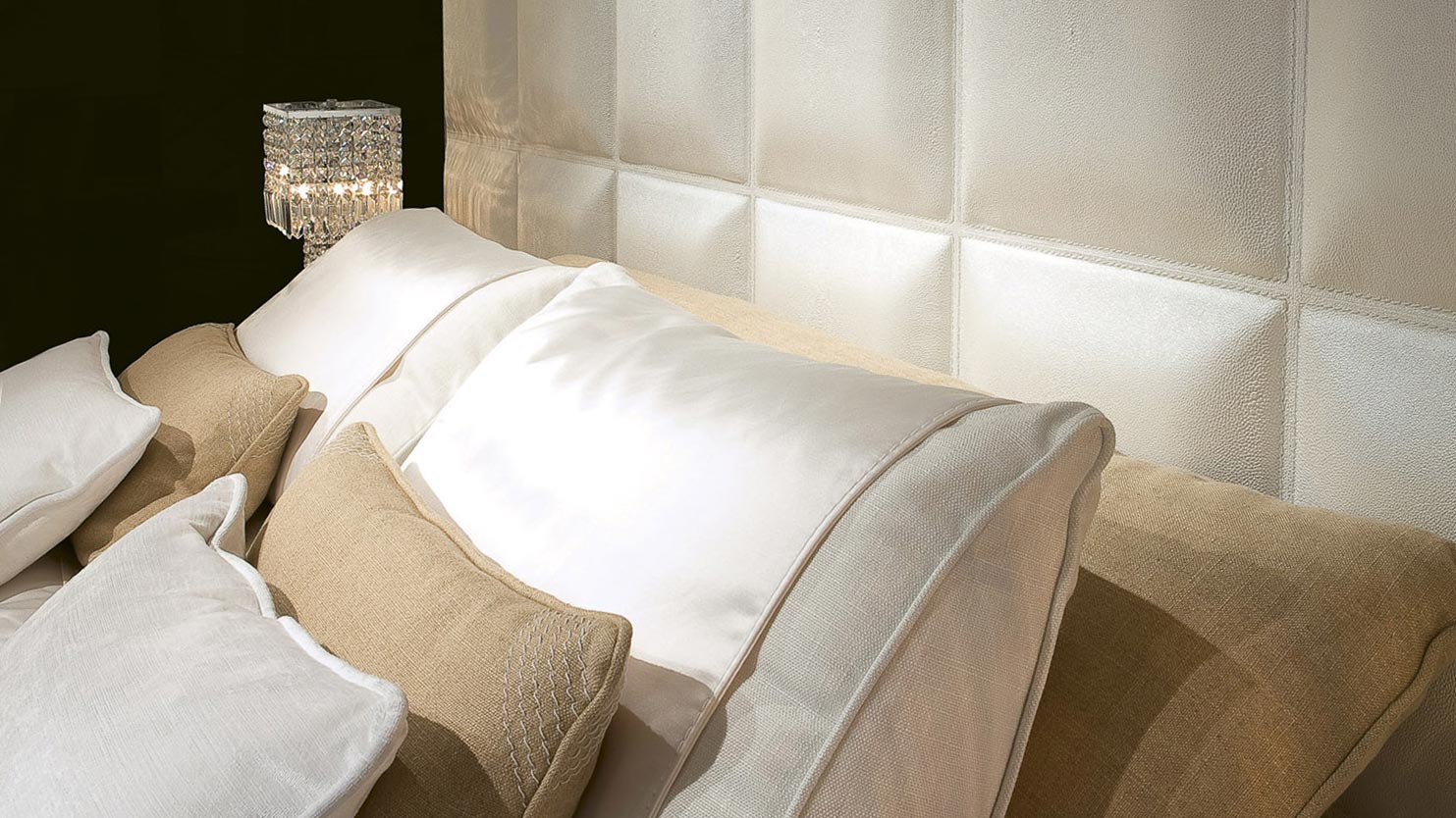 La base imbottita, lineare e proporzionata, dialoga con la testiera in perfetta continuità, mentre l’integrazione di elementi luminosi sottolinea l’atmosfera sofisticata e scenografica che il modello è in grado di creare. Ogni dettaglio è eseguito con cura sartoriale e materiali pregiati, a conferma della filosofia Rugiano orientata all’eccellenza e all’esclusività.