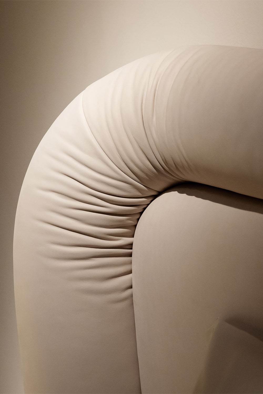 Il letto Loom si distingue per la sua imponente testiera imbottita, che abbraccia l’intera struttura con linee avvolgenti e generose. Il rivestimento, realizzato in pelle o tessuto di pregio, esalta le curvature morbide e continue, dando vita a una silhouette di grande impatto visivo. Inserti metallici orizzontali spezzano con eleganza la verticalità della testiera, introducendo un accento prezioso e contemporaneo che valorizza ulteriormente la sua presenza scenografica.