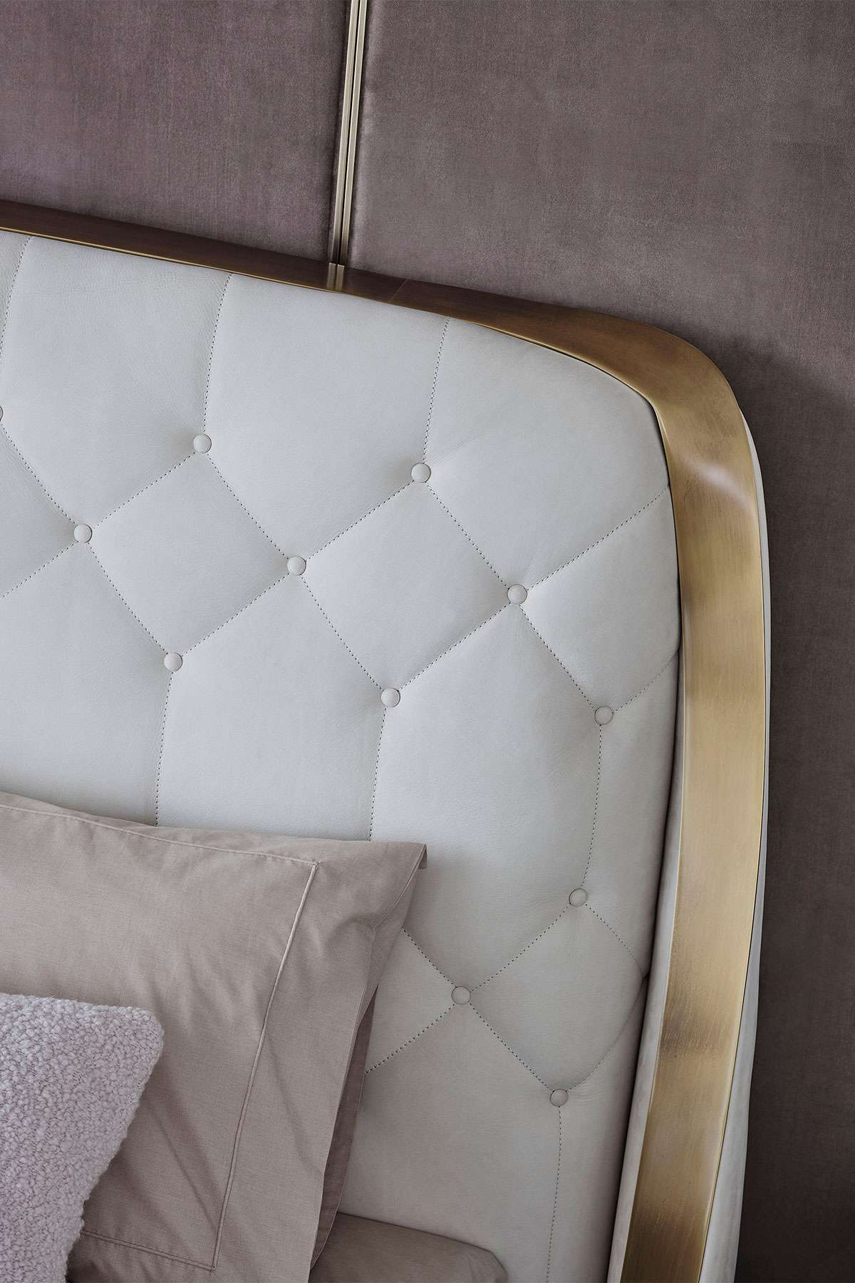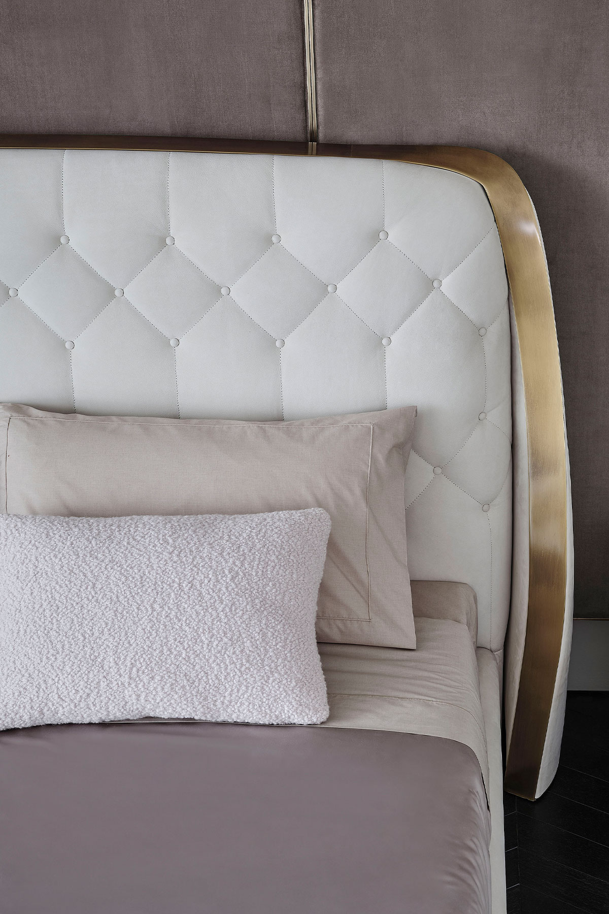 La testata di Madam emerge con forza scenica grazie all’imbottitura generosa e al rivestimento in pelle liscia o stampata, dove ogni cucitura e dettaglio sottolineano l’eccellenza artigianale. Il profilo rivestito del contorno agisce come elemento d’ordine, incorniciando la morbidezza con rigore e trasformando la struttura in un quadro materico.