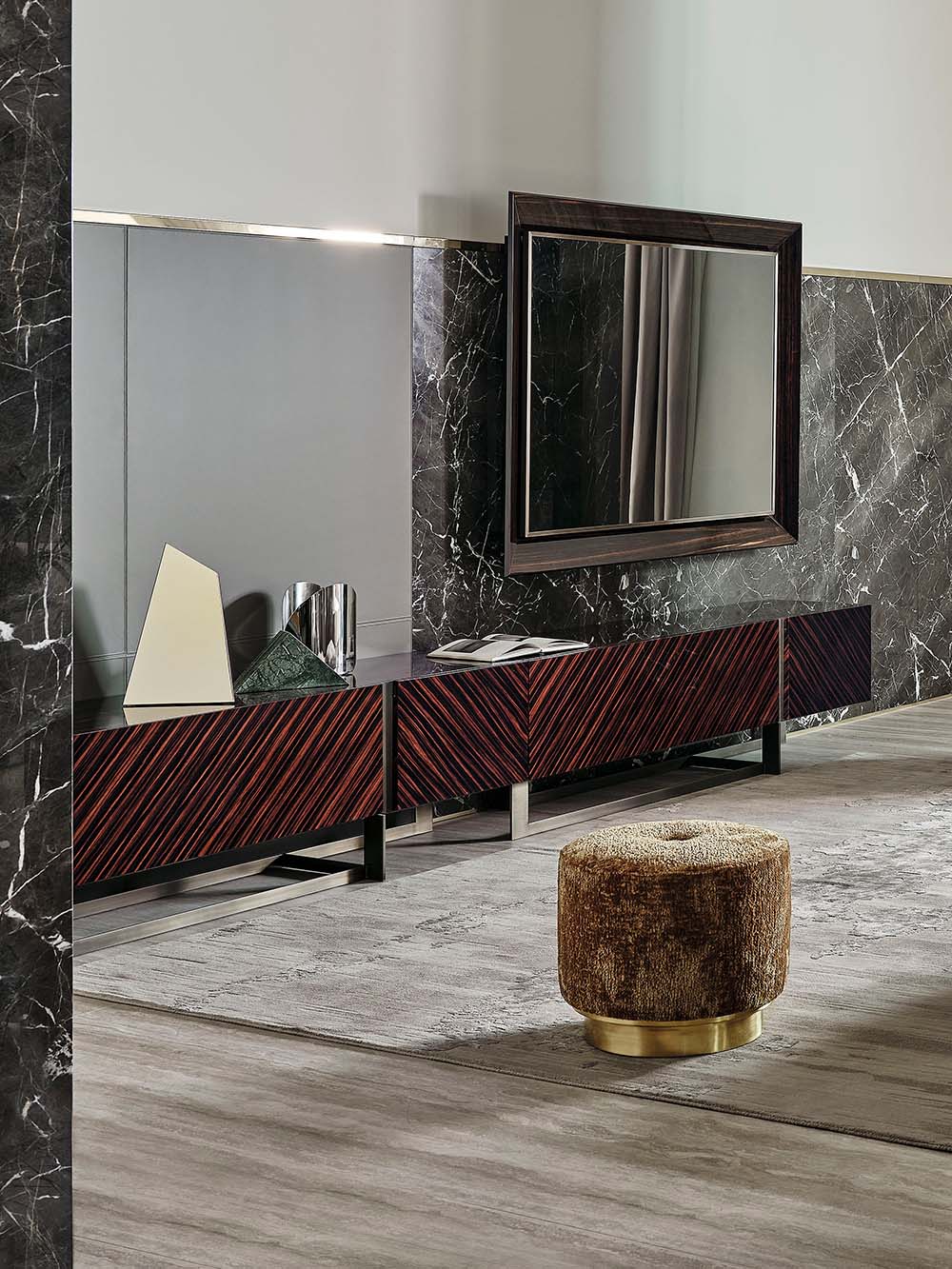 Mobile porta TV. Base in bronzo, acciaio o cromo nero. Strutture in ebano o rivestite in pelle ed ante in ebano, rivestite in pelle o decoro per la versione alta della credenza.