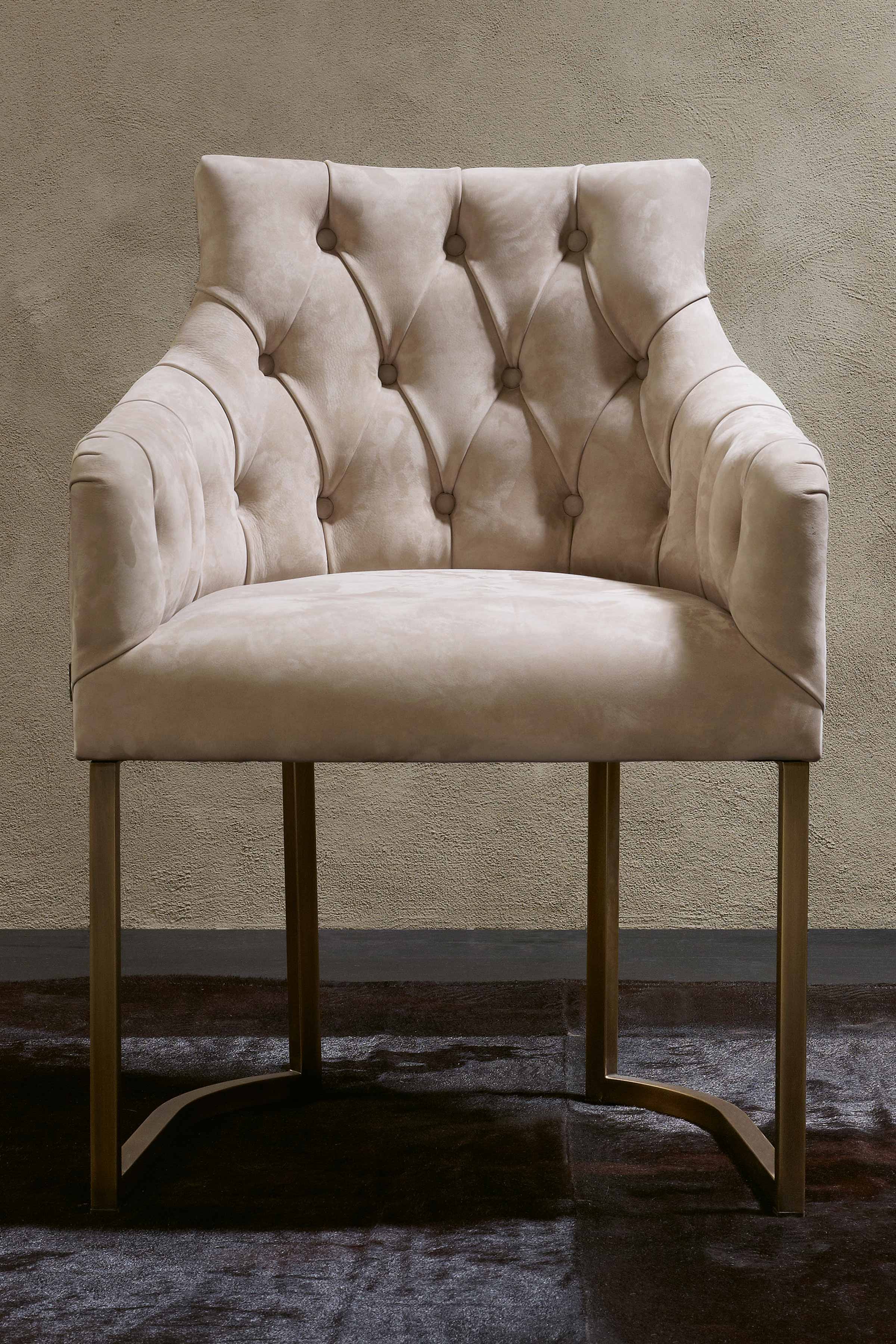 Sedia rivestita con gambe in metallo. Disponibile anche la versione con schienale capitonne o con retro e scocca rivestite in pelle stampata.