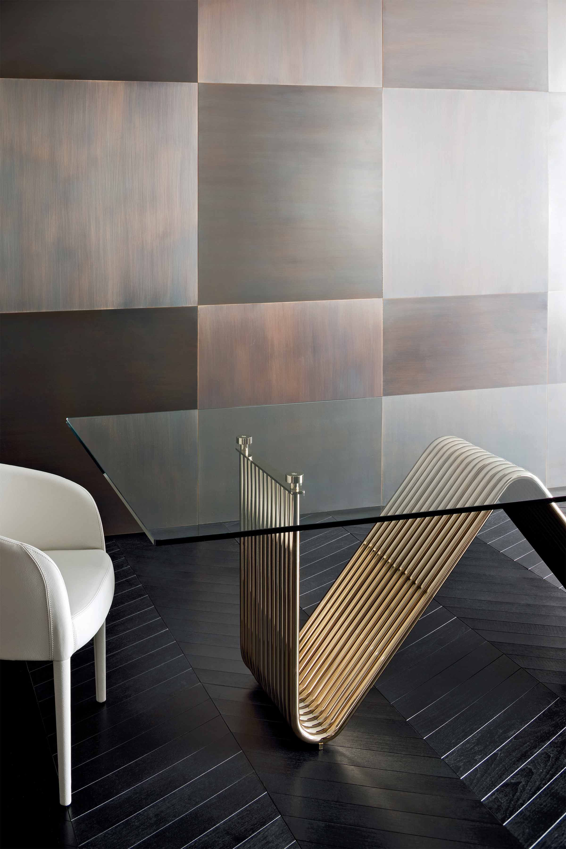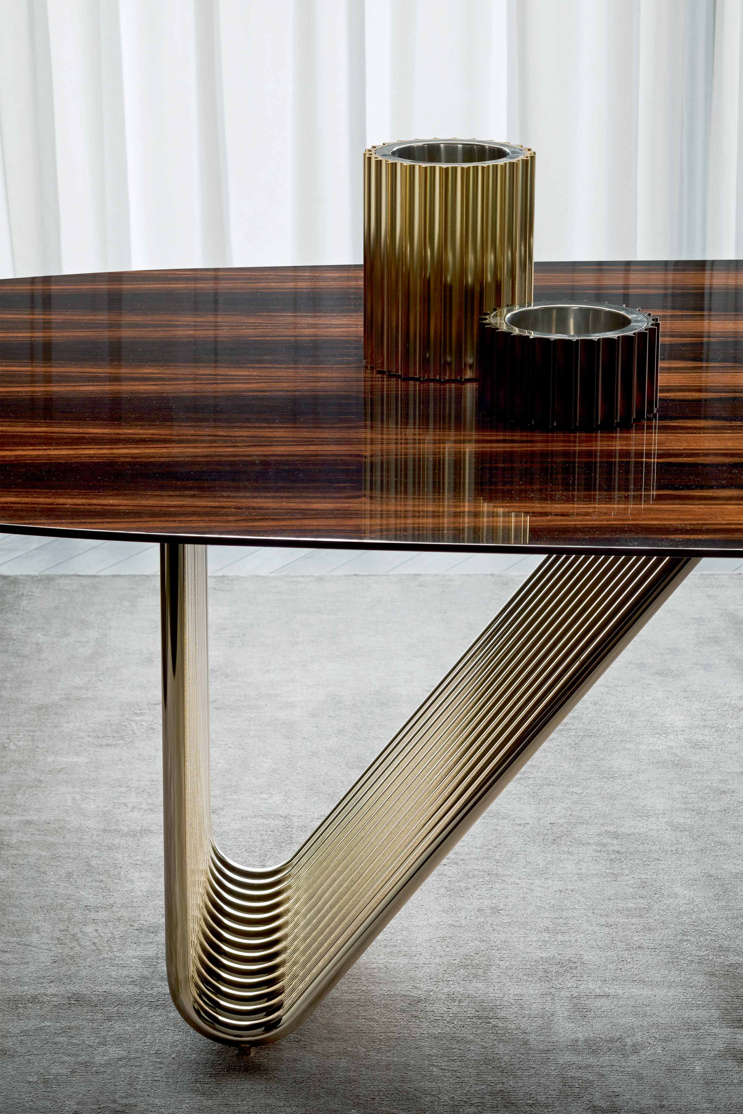 Una serie di tubolari in oro chiaro o cromo nero accostati e curvati elgantemente creano la base del tavolo.