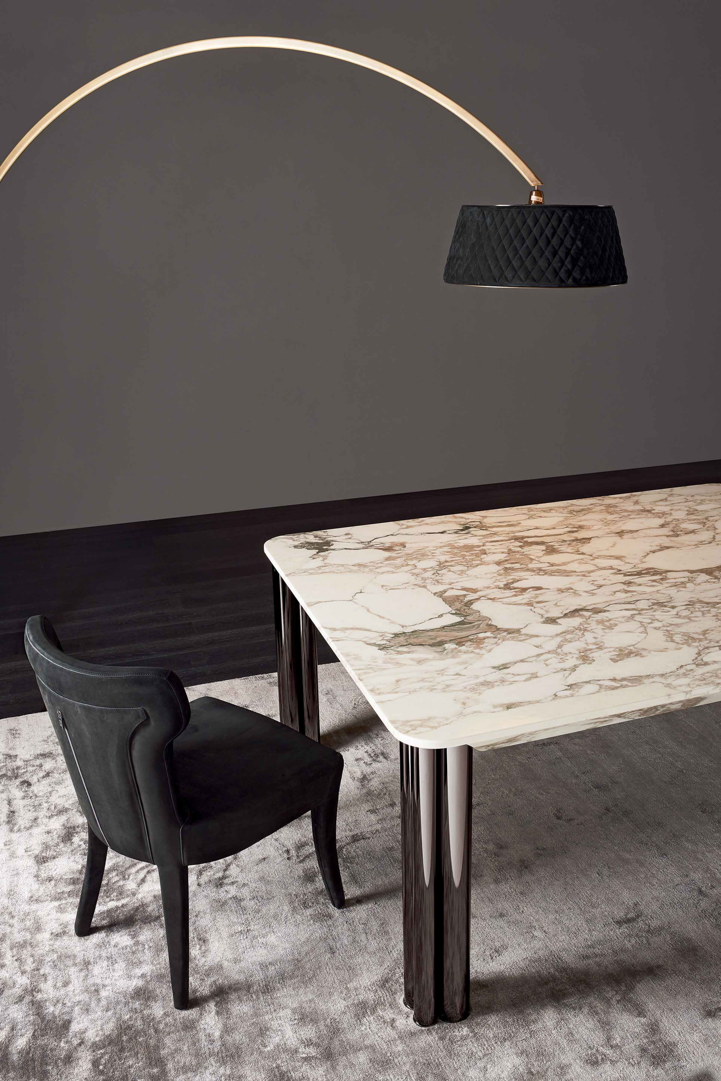 Oro lucido o cromo nero caratterizzato le gambe importanti. Piani disponibili in diverse forme e misure in legno, marmo, rivestiti in pelle o decorati.