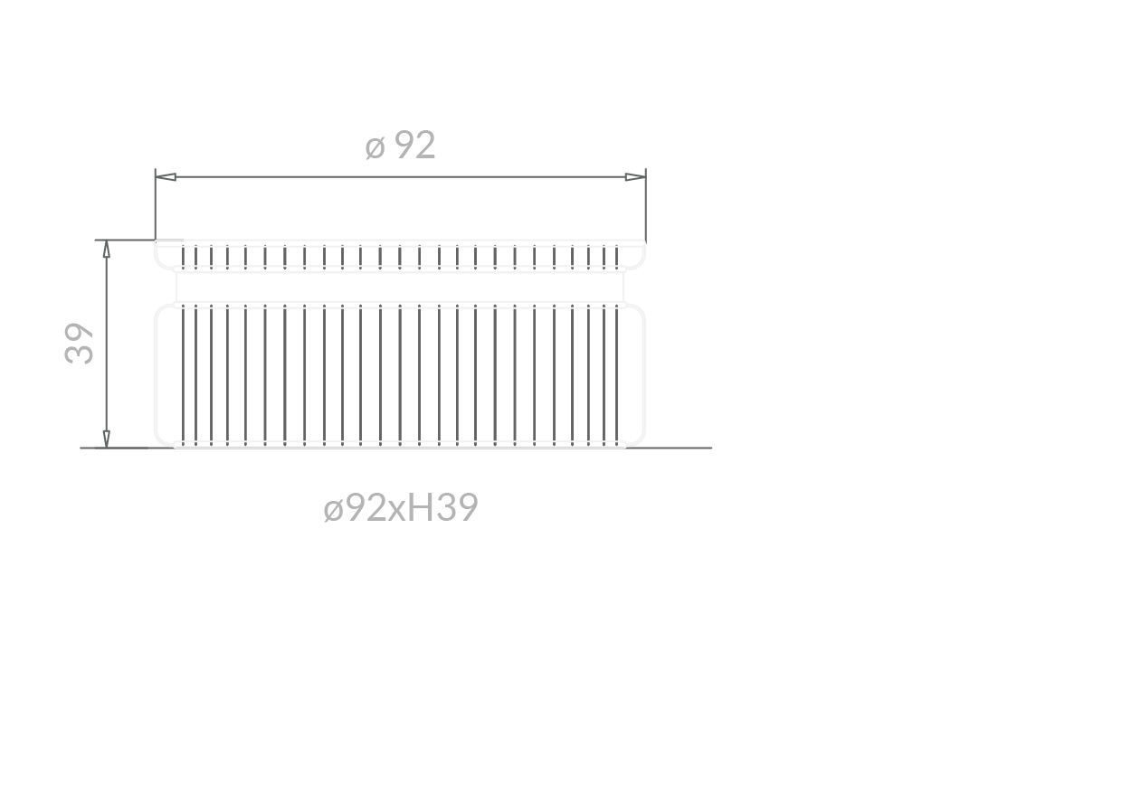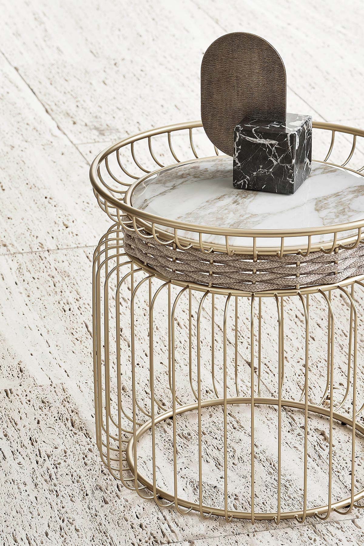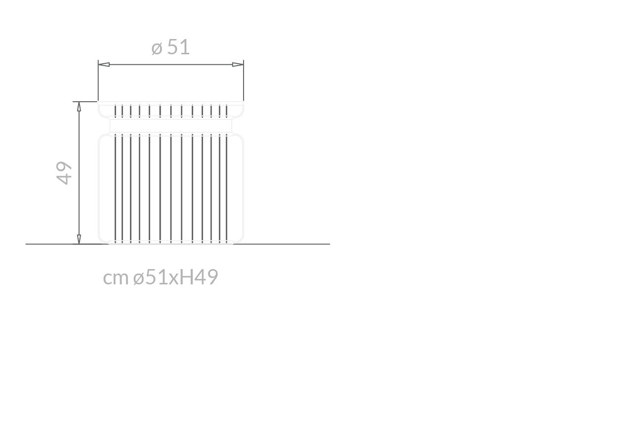 Collezione di tavolini in diverse misure e altezze. Base caratterizzata da una sequenza regolare di tondini in metallo.