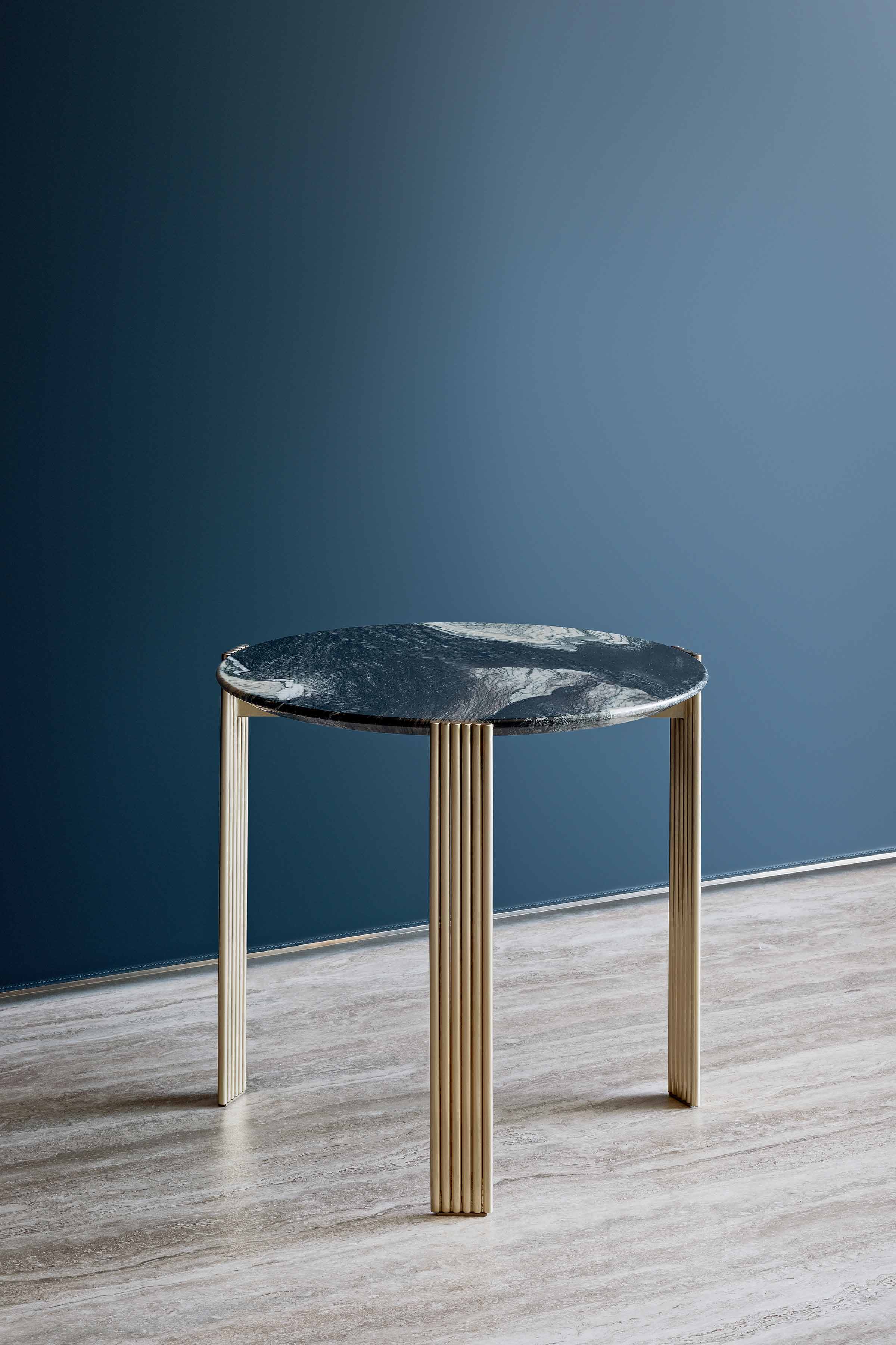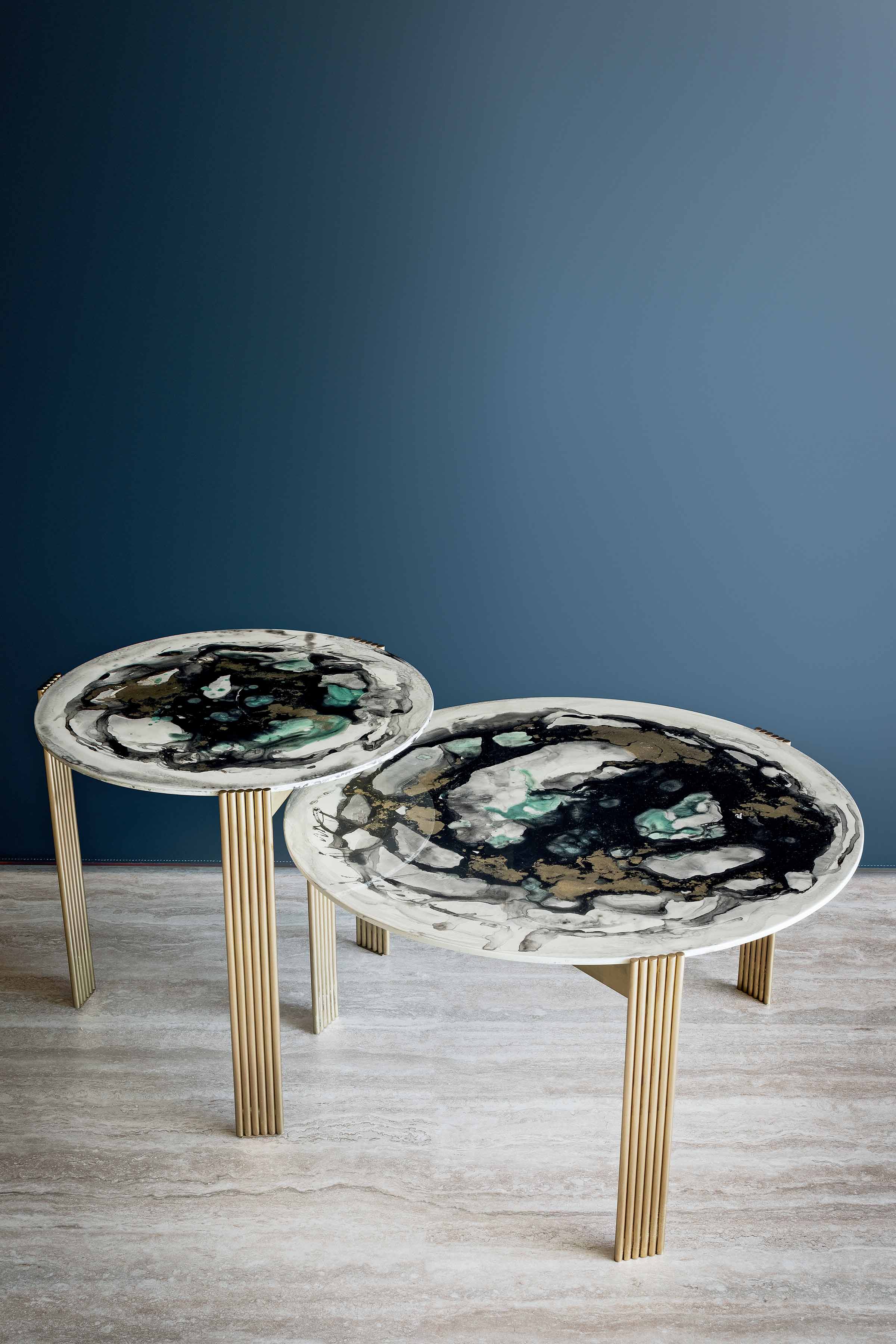 Basi in ottone spazzolato. Caratteristica la trafila che da vita alle gambe. Diverse altezze, piani tondi ed un ovale irregolare disponibili in marmo o decorati.