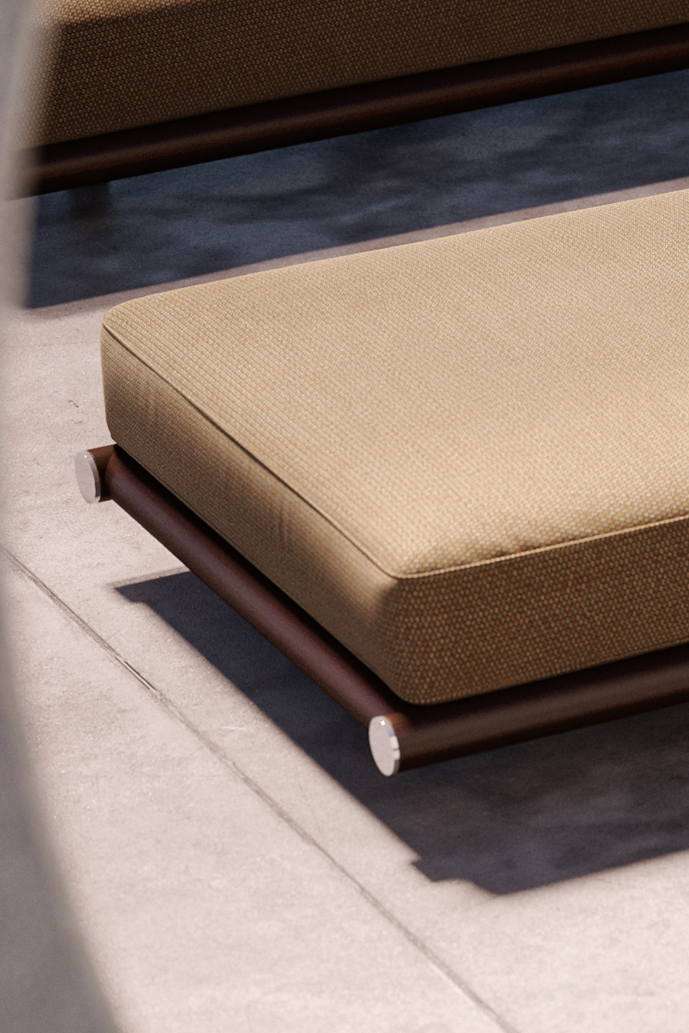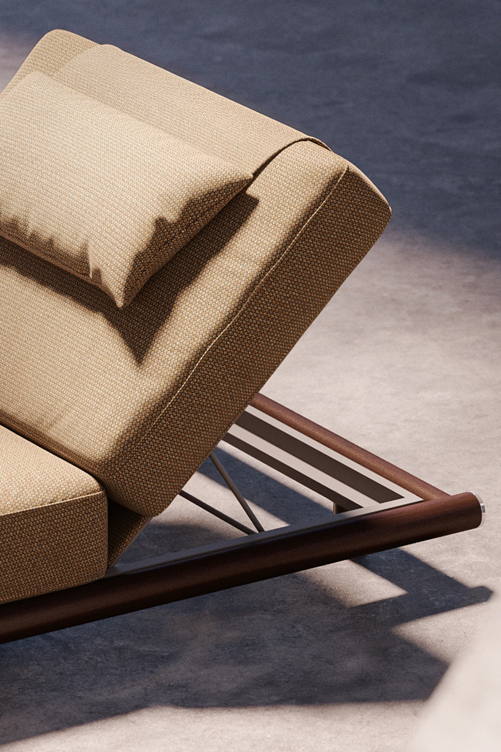 La struttura è realizzata in pregiato legno di mogano, con eleganti dettagli cromati a contrasto, che ne valorizzano il disegno contemporaneo. I volumi imbottiti, rivestiti in tessuti outdoor, appoggiano su una base ribassata con piedini discreti, mentre lo schienale reclinabile consente un’esperienza di relax completamente personalizzabile.