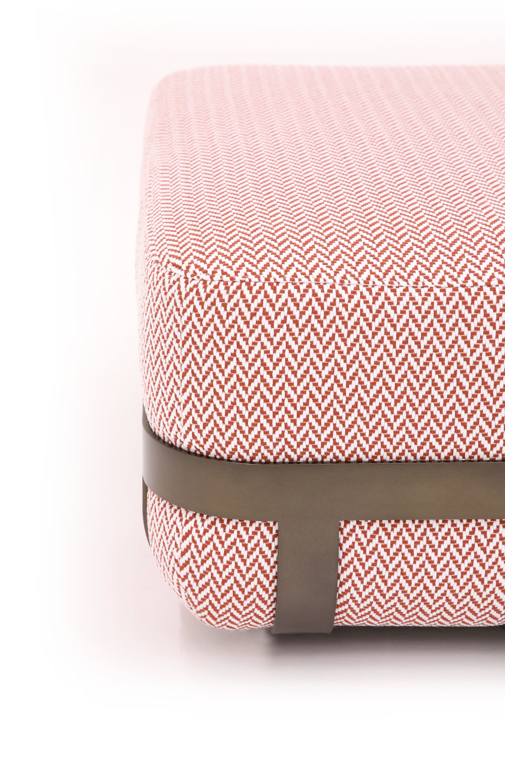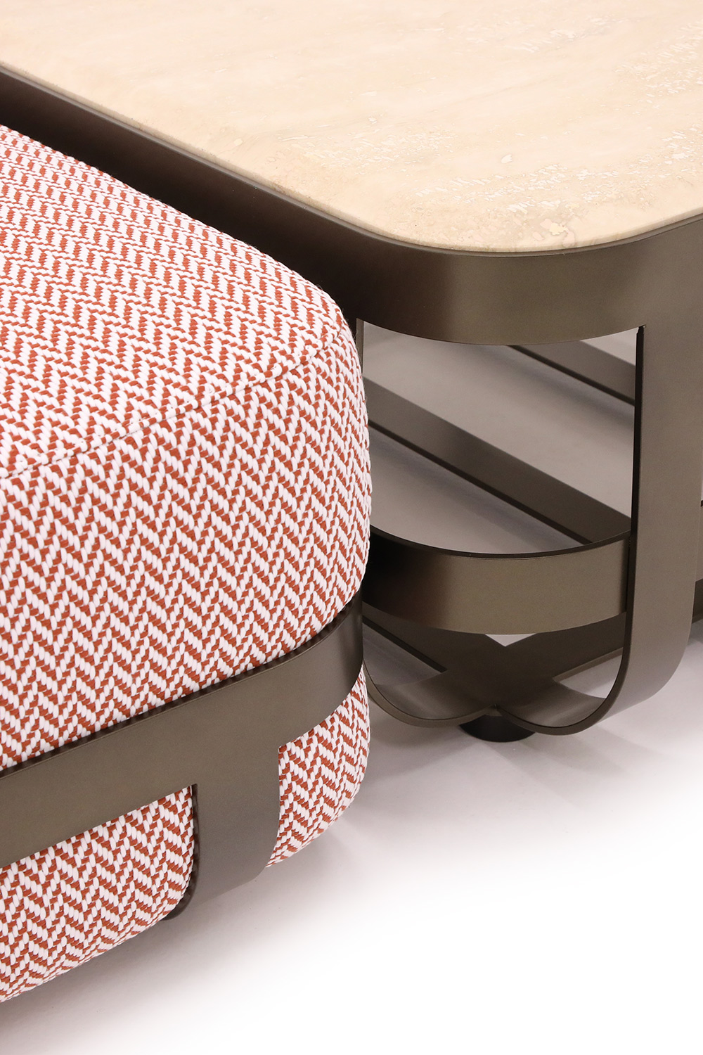 Le fasce metalliche disposte con ritmo grafico avvolgono la seduta imbottita, creando un equilibrio tra matericità e leggerezza visiva. L’imbottitura, generosa e accogliente, ne fa un complemento ideale per arricchire salotti open-air, lounge o terrazze esclusive.
