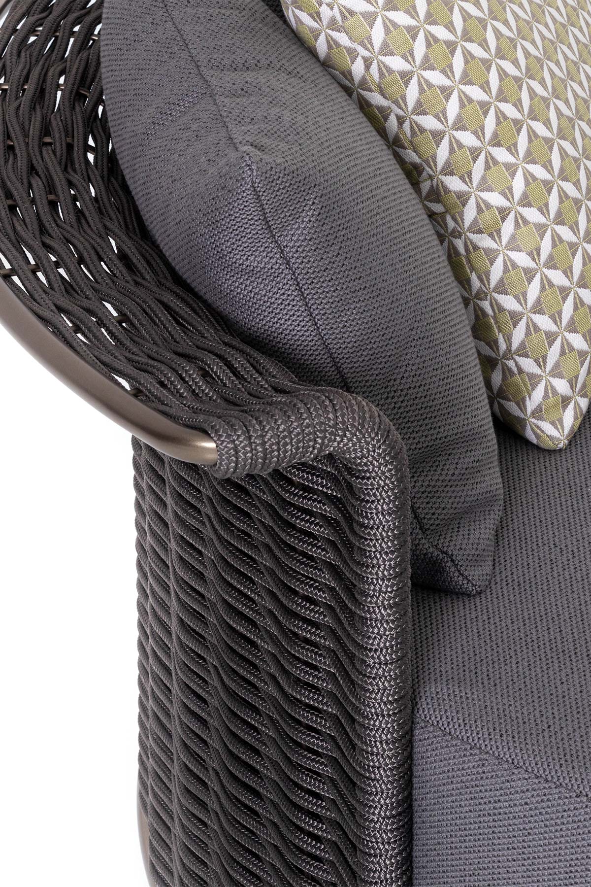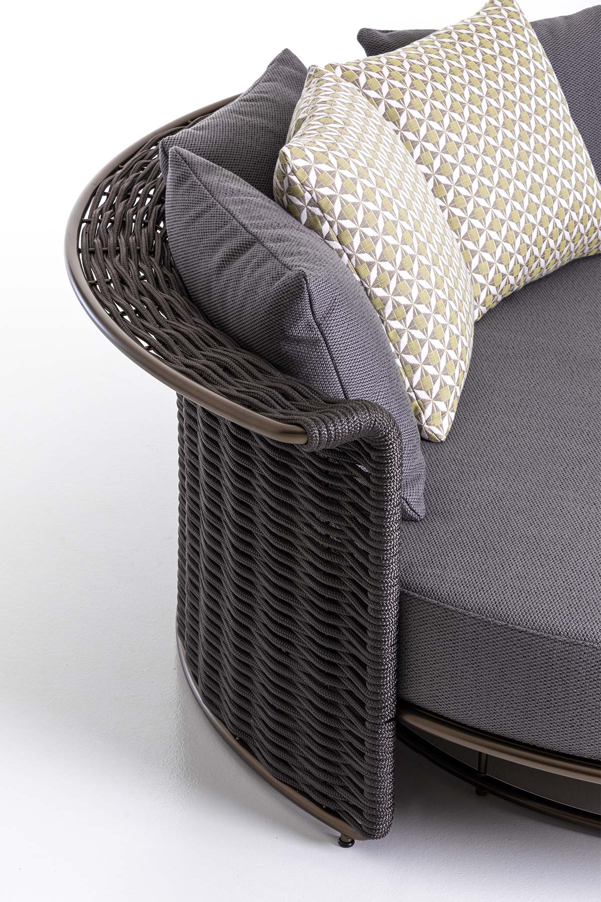 La struttura in metallo bronzo outdoor è interamente rivestita da corda intrecciata a mano, elemento distintivo della linea Marina, che dona texture, comfort e una forte identità materica. I dettagli curvi del bracciolo e la cornice superiore in metallo conferiscono armonia e fluidità al profilo, riprendendo i codici stilistici degli altri elementi della collezione.