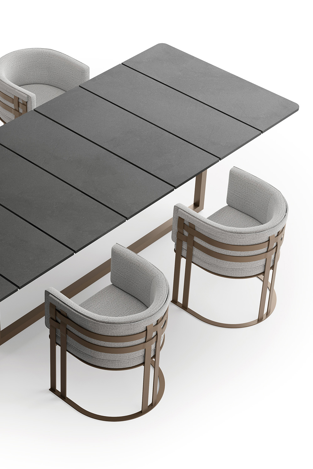 Il design si affida a volumi netti e proporzioni rigorose, dove ogni elemento è ridotto all’essenziale senza perdere forza espressiva. La base geometrica in acciaio bronzo outdoor, sostiene un piano composto da doghe regolari in pietra o legno, a seconda della configurazione. Il disegno modulare, rigoroso ma fluido, crea un ritmo visivo continuo che si adatta con naturalezza a contesti residenziali o contract di alto profilo.