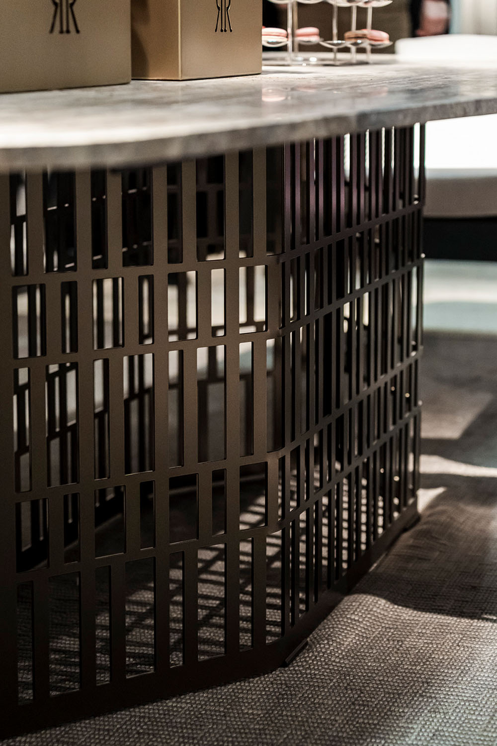 La sua base, realizzata in bronzo per esterni, si sviluppa come una struttura geometrica aperta, un reticolo tridimensionale dove pieni e vuoti si alternano con ritmo calibrato. Il risultato è una forma decisa ma leggera, grafica ma mai statica, pensata per creare trasparenza visiva e profondità architettonica.